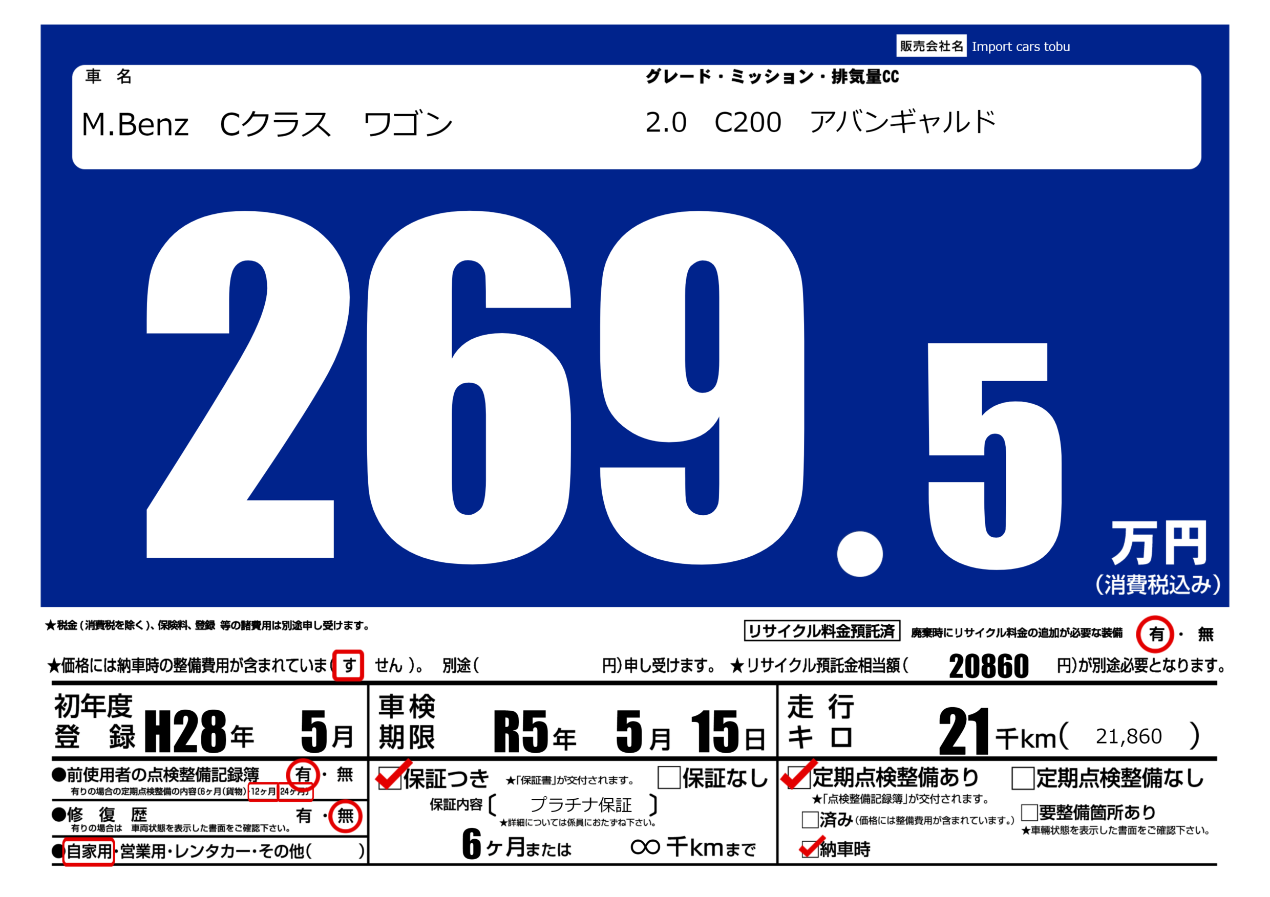 | 車名 | M.Benz Cクラス ワゴン | グレード ミッション 排気量 |