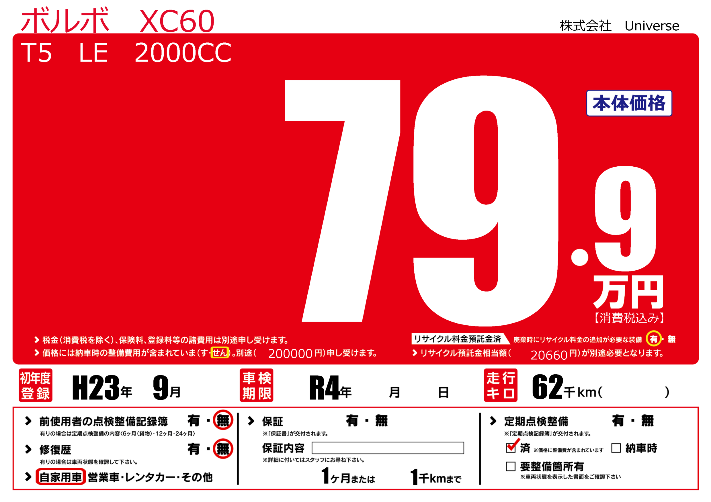 | 定期点検整備 | 定期点検整備済み | ||