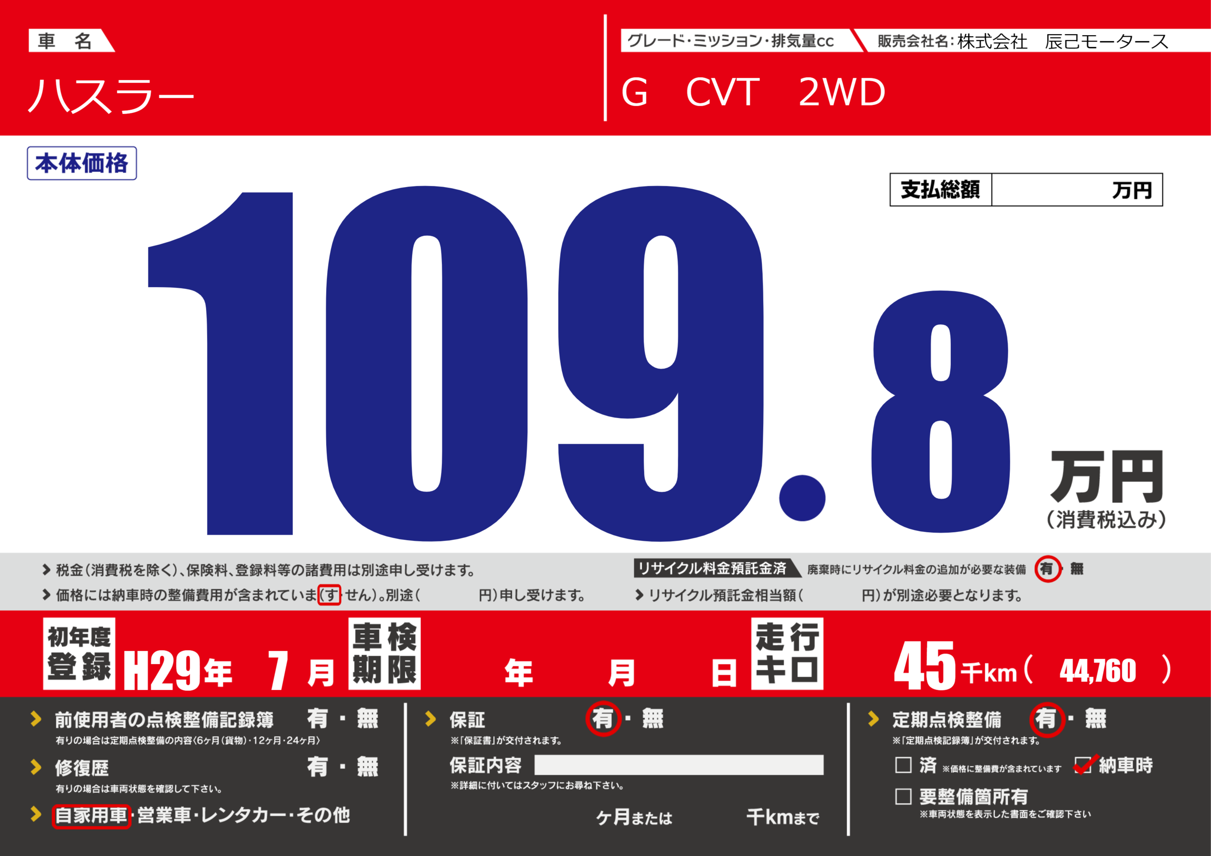 | 車名 | ハスラー | グレード ミッション 排気量 |