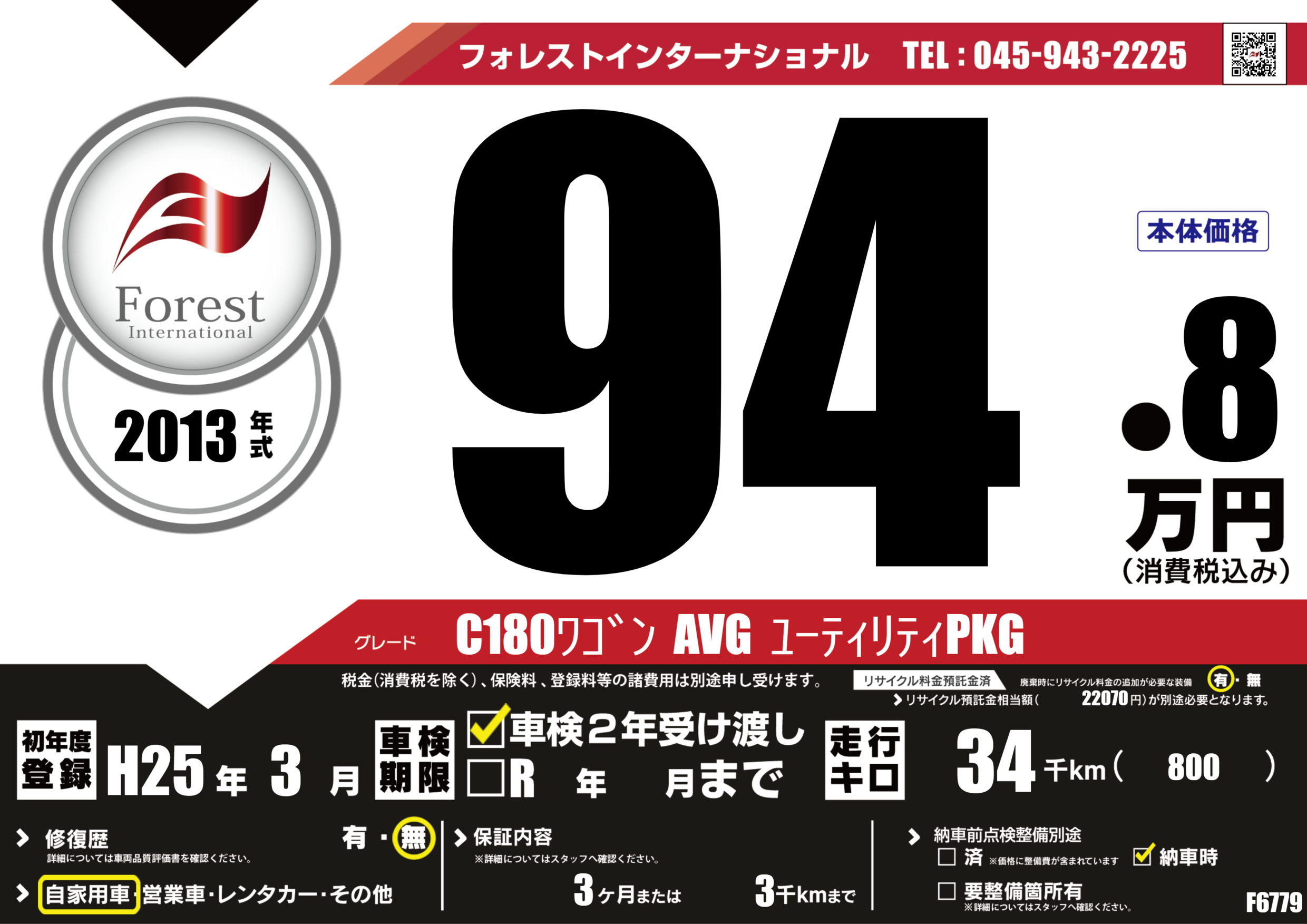 | 走行キロ | 3.4万km | 初年度登録 | H25年3月 |
