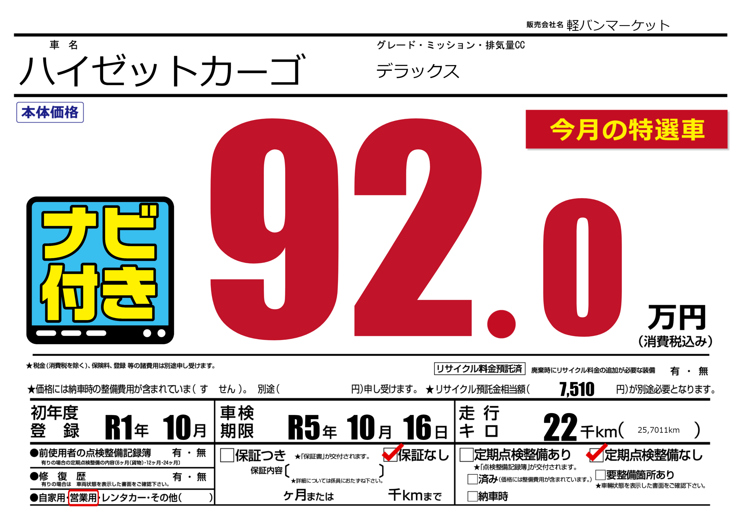 | 車名 | ハイゼットカーゴ | グレード ミッション 排気量 |