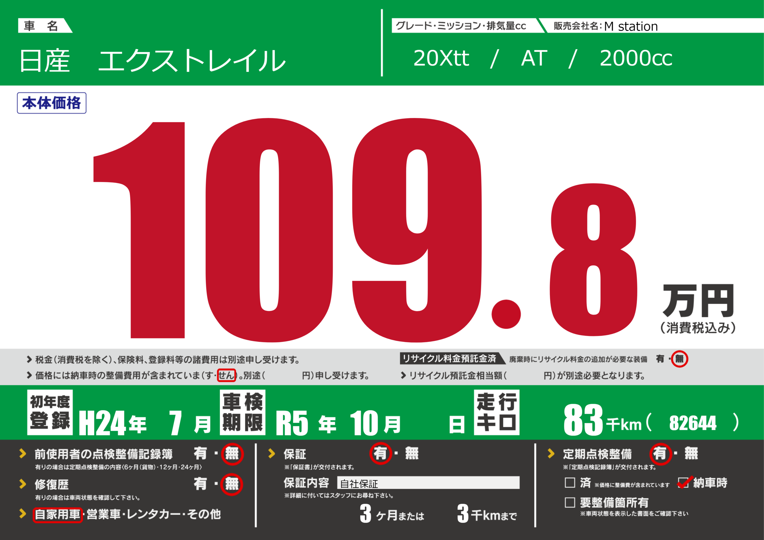 | 車名 | 日産 エクストレイル | グレード ミッション 排気量 |