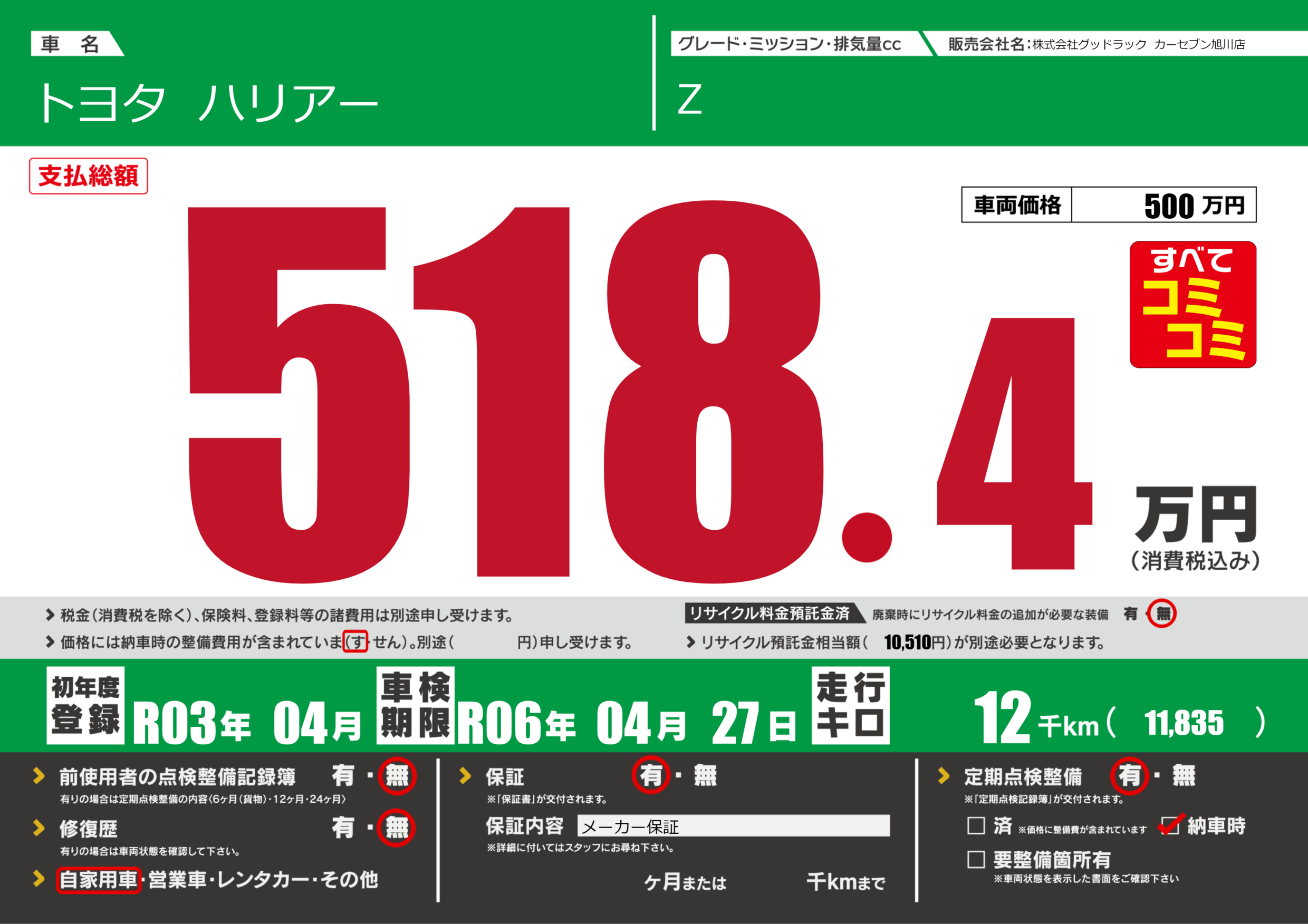 保証付き 保証内容(メーカー保証) ---ヶ月または()千kmまで |