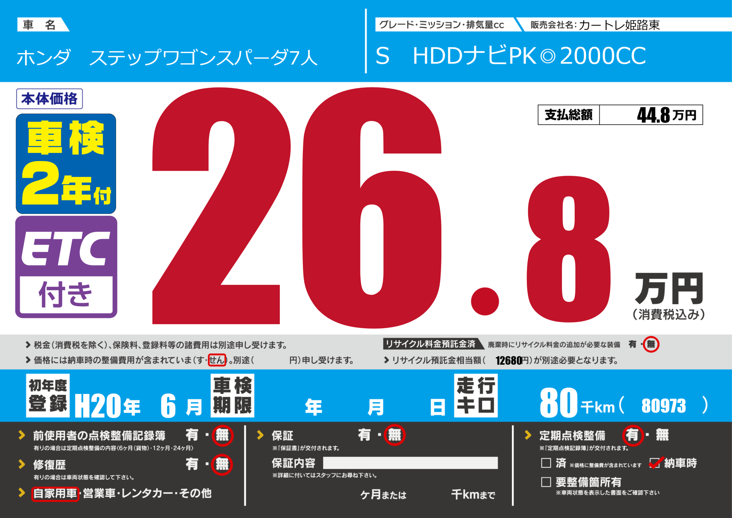 | 走行キロ | 8万km | 初年度登録 | H20年6月 |