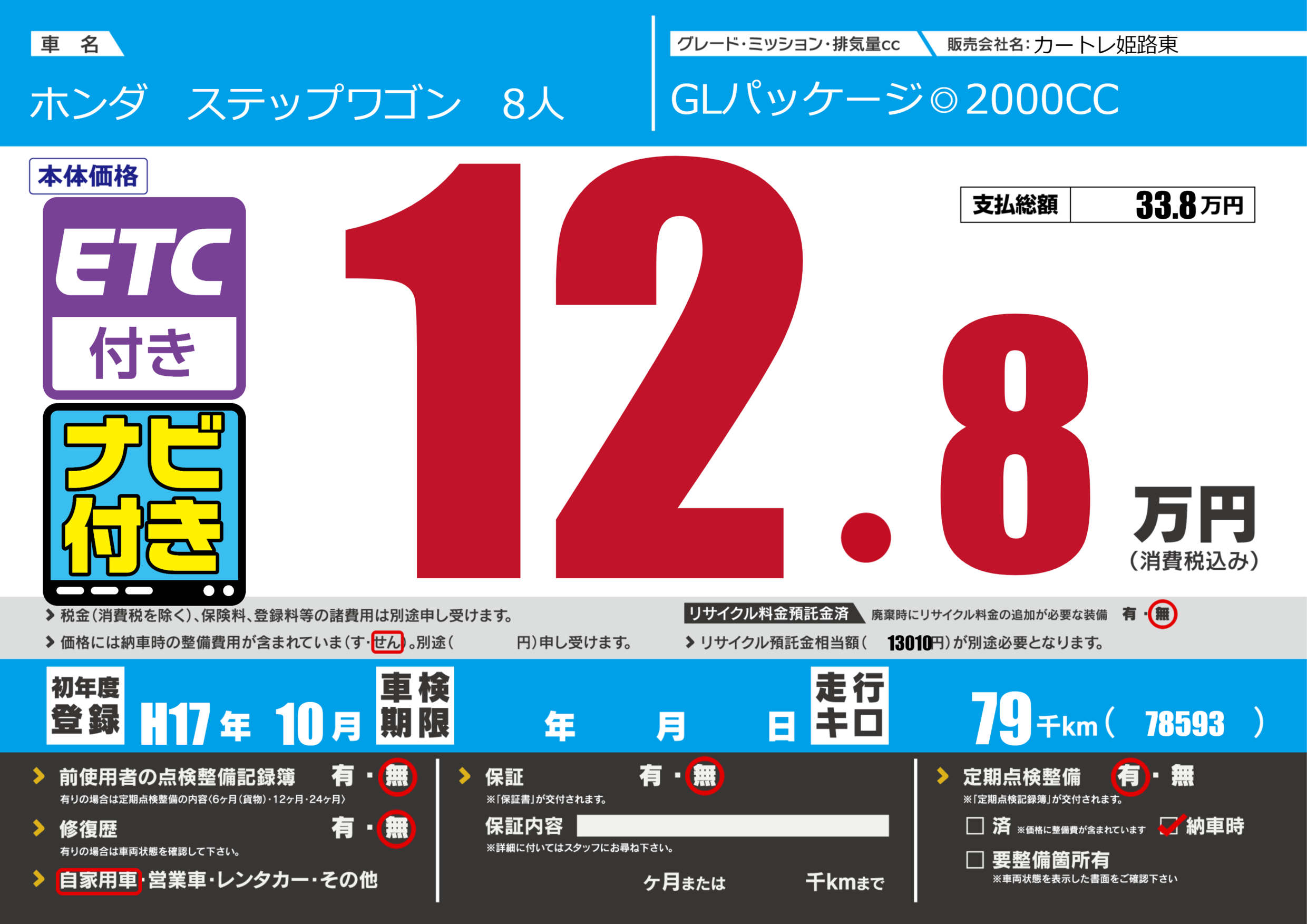 | 走行キロ | 7.9万km | 初年度登録 | H17年10月 |