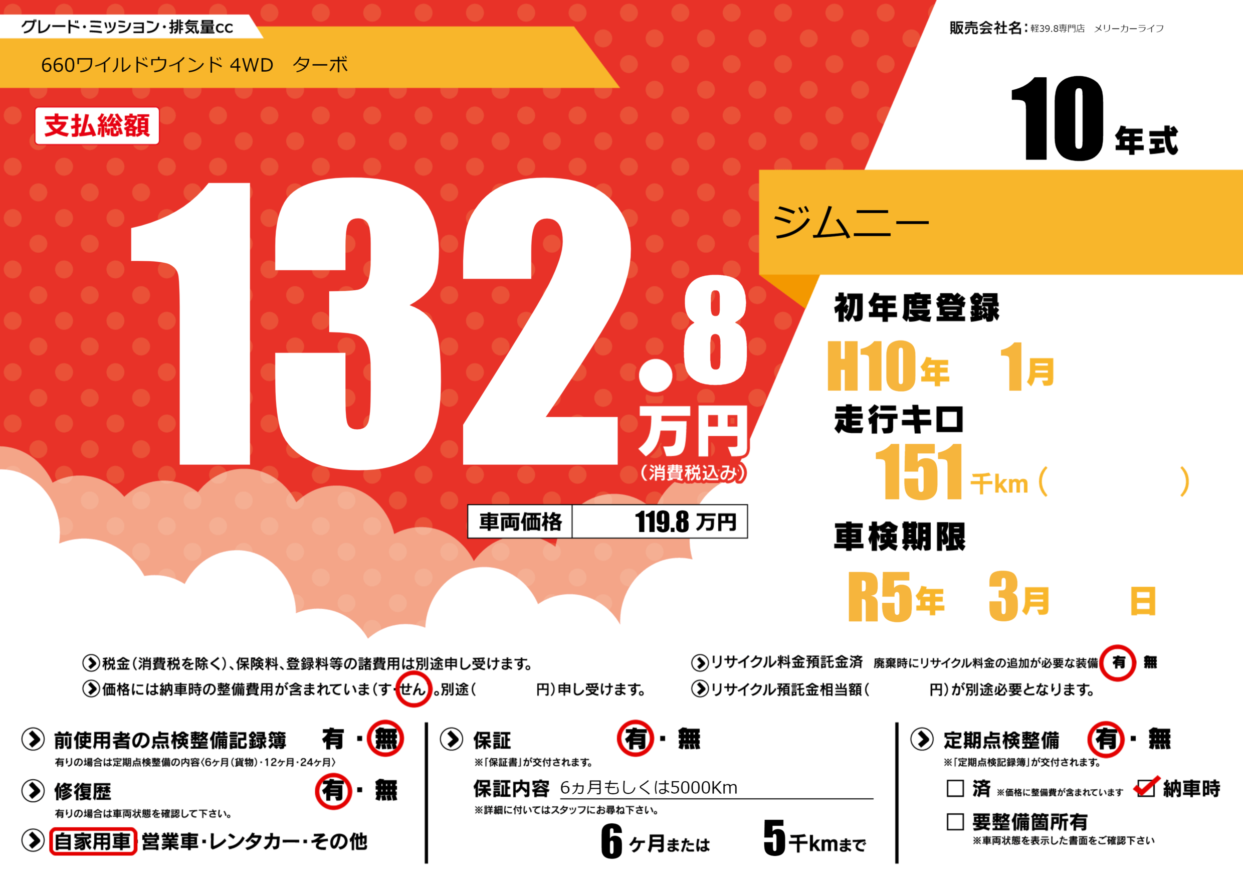 | 走行キロ | 15.1万km | 初年度登録 | H10年1月 |