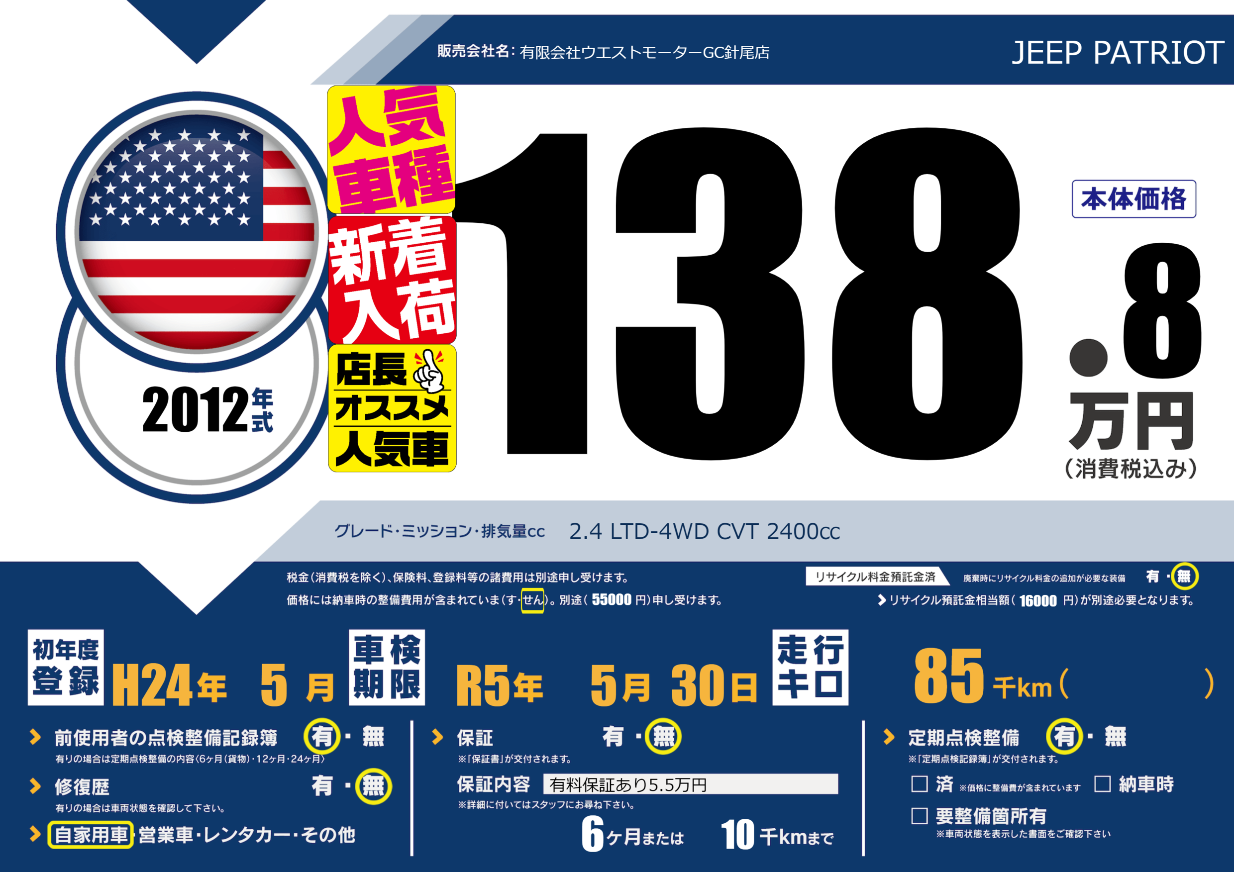 | 車名 | JEEP PATRIOT | グレード ミッション 排気量 |