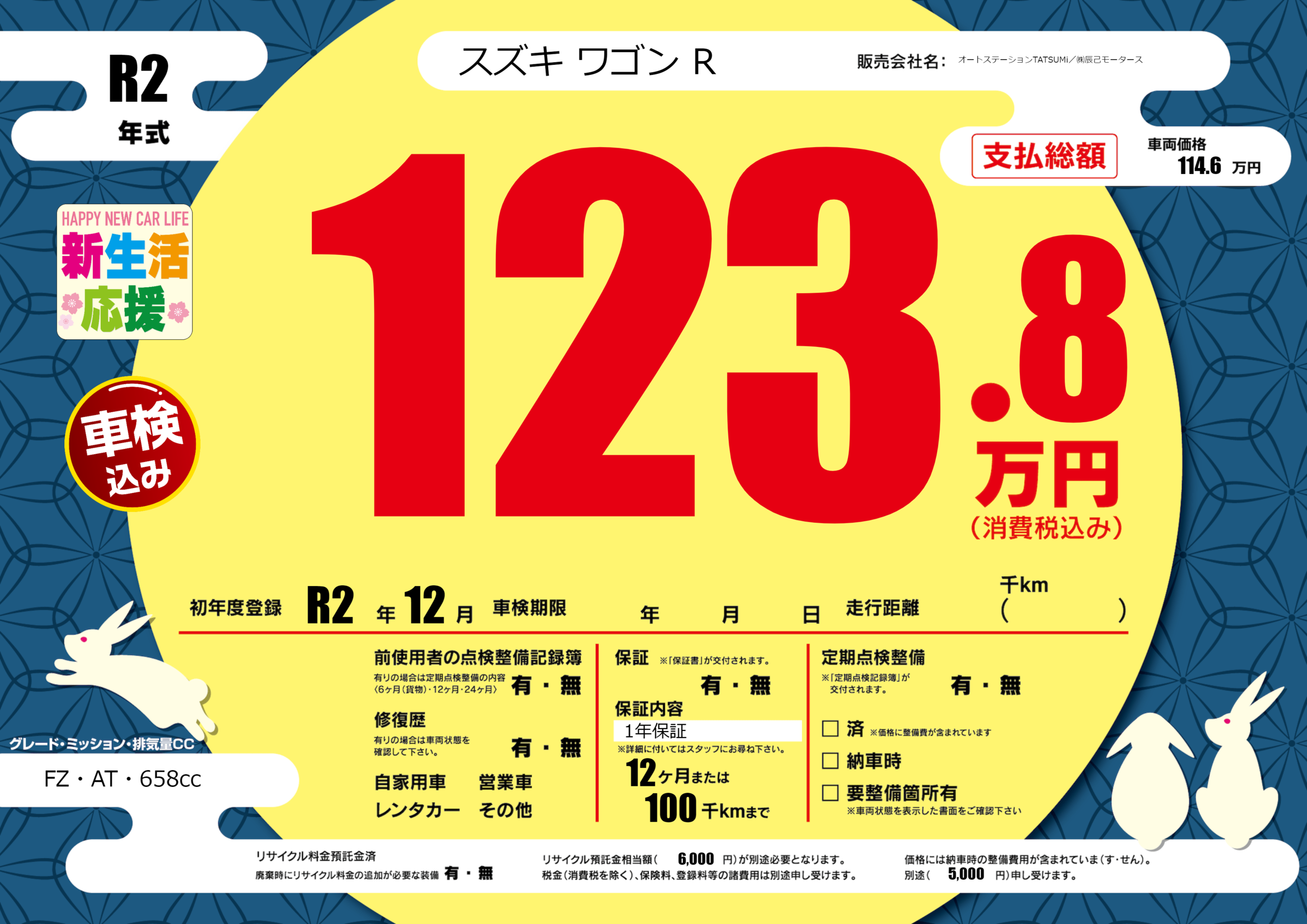| 車名 | スズキ ワゴン R | グレード ミッション 排気量 |