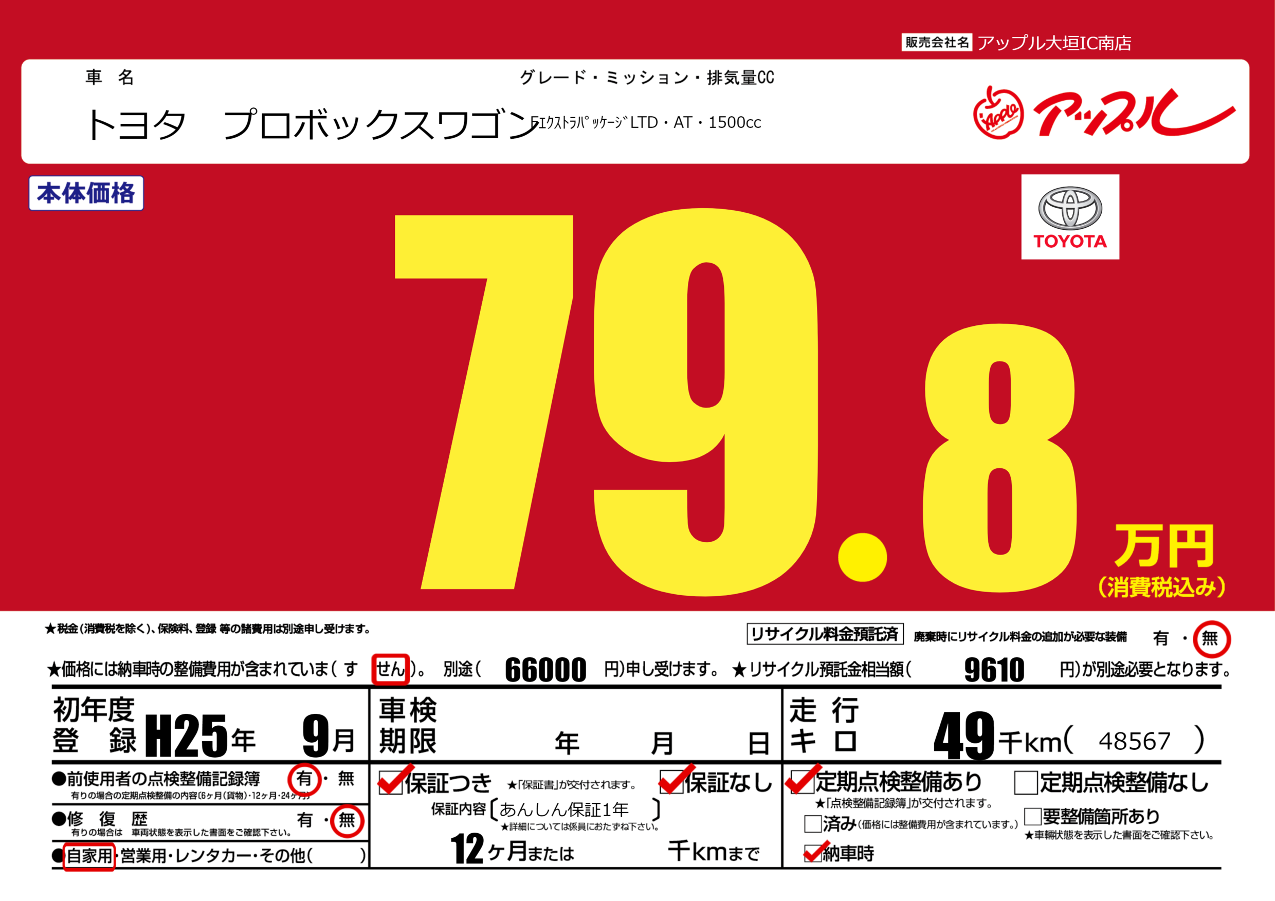 | 車名 | トヨタ プロボックスワゴン | グレード ミッション 排気量 |