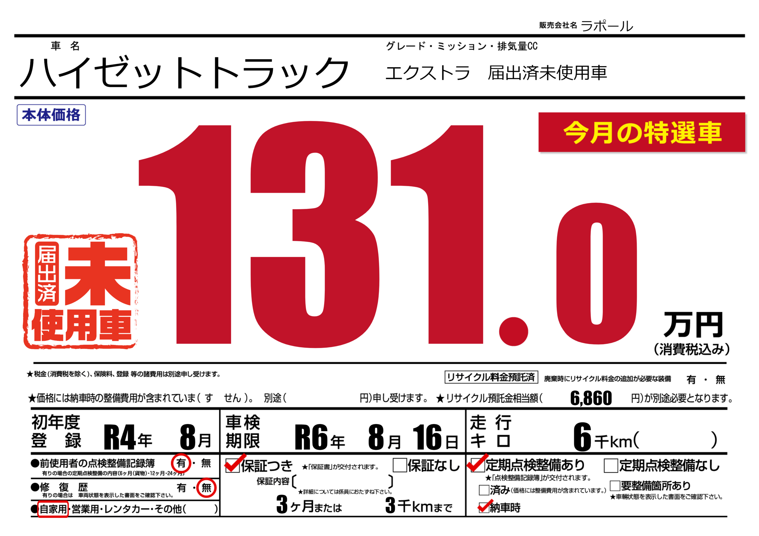| 走行キロ | 0.6万km | 初年度登録 | R4年8月 |