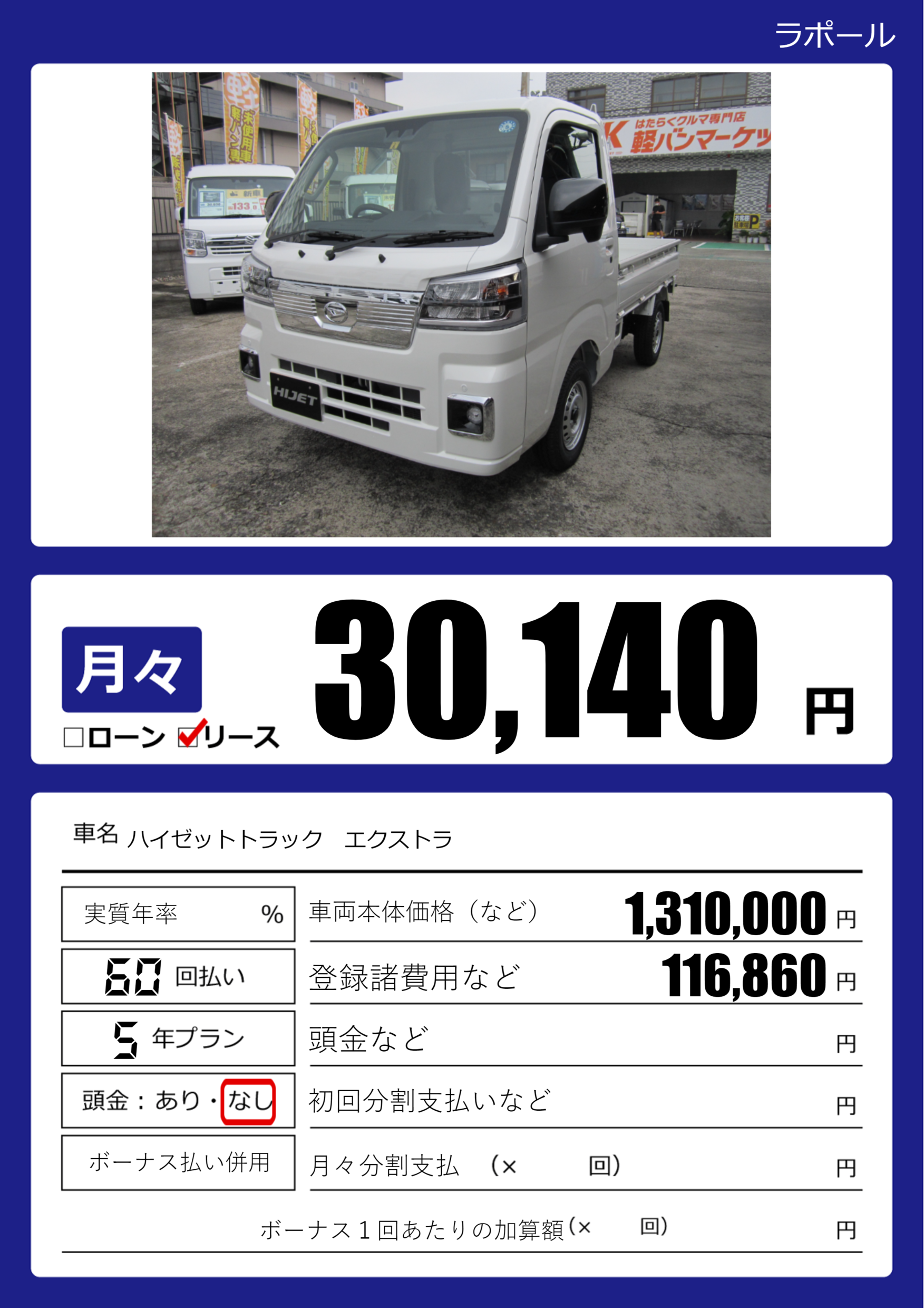 | 車名 | ハイゼットトラック エクストラ | グレード ミッション 排気量 |