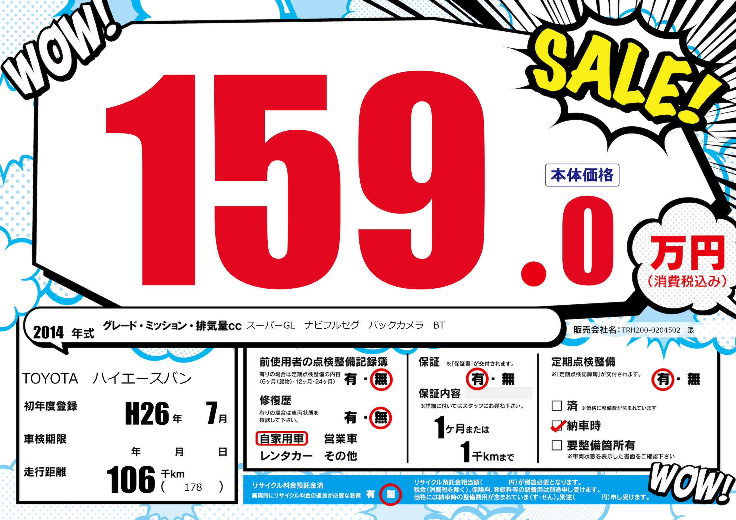 | 車名 | TOYOTA ハイエースバン | グレード ミッション 排気量 |