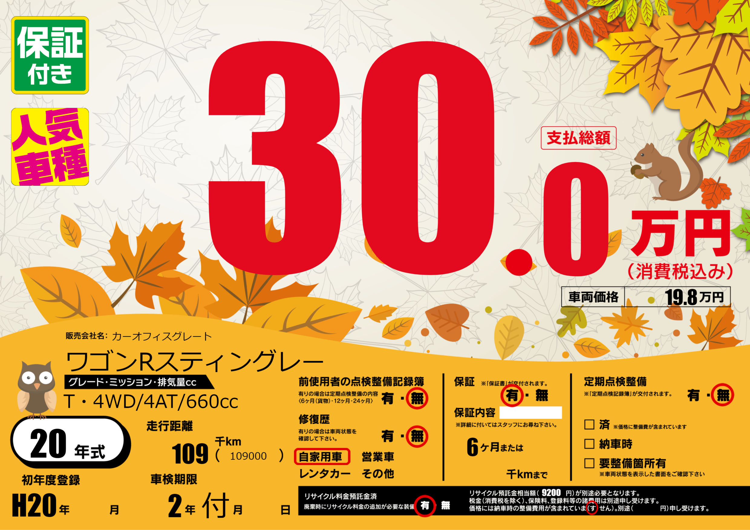 | 走行キロ | 10.9万km | 初年度登録 | H20年---月 |