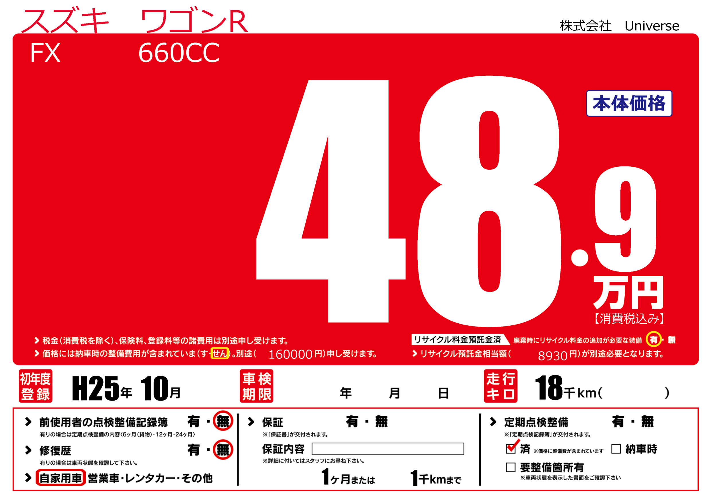 | 車名 | スズキ ワゴンR | グレード ミッション 排気量 |