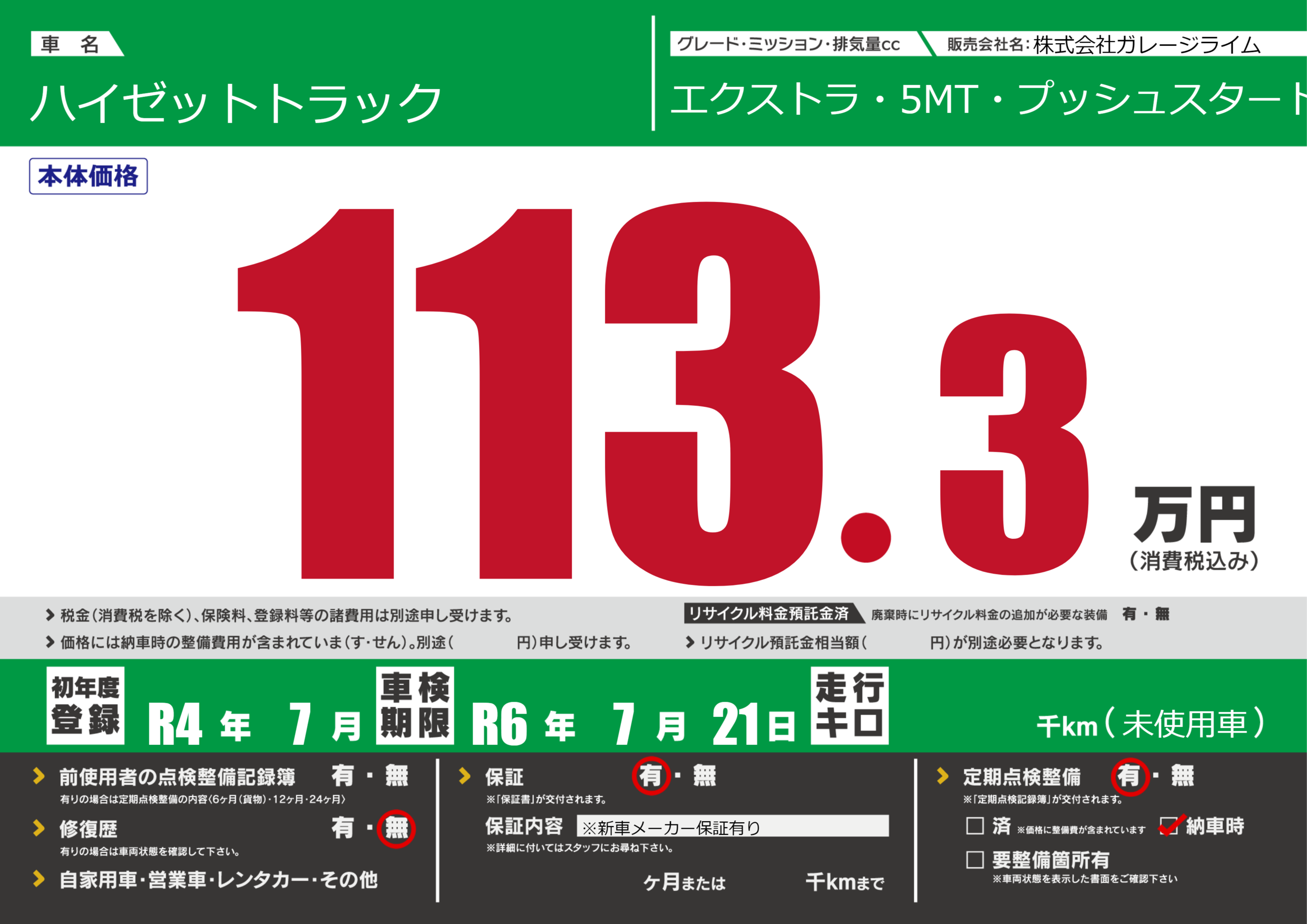 保証付き 保証内容(※新車メーカー保証有り) ヶ月または千km |