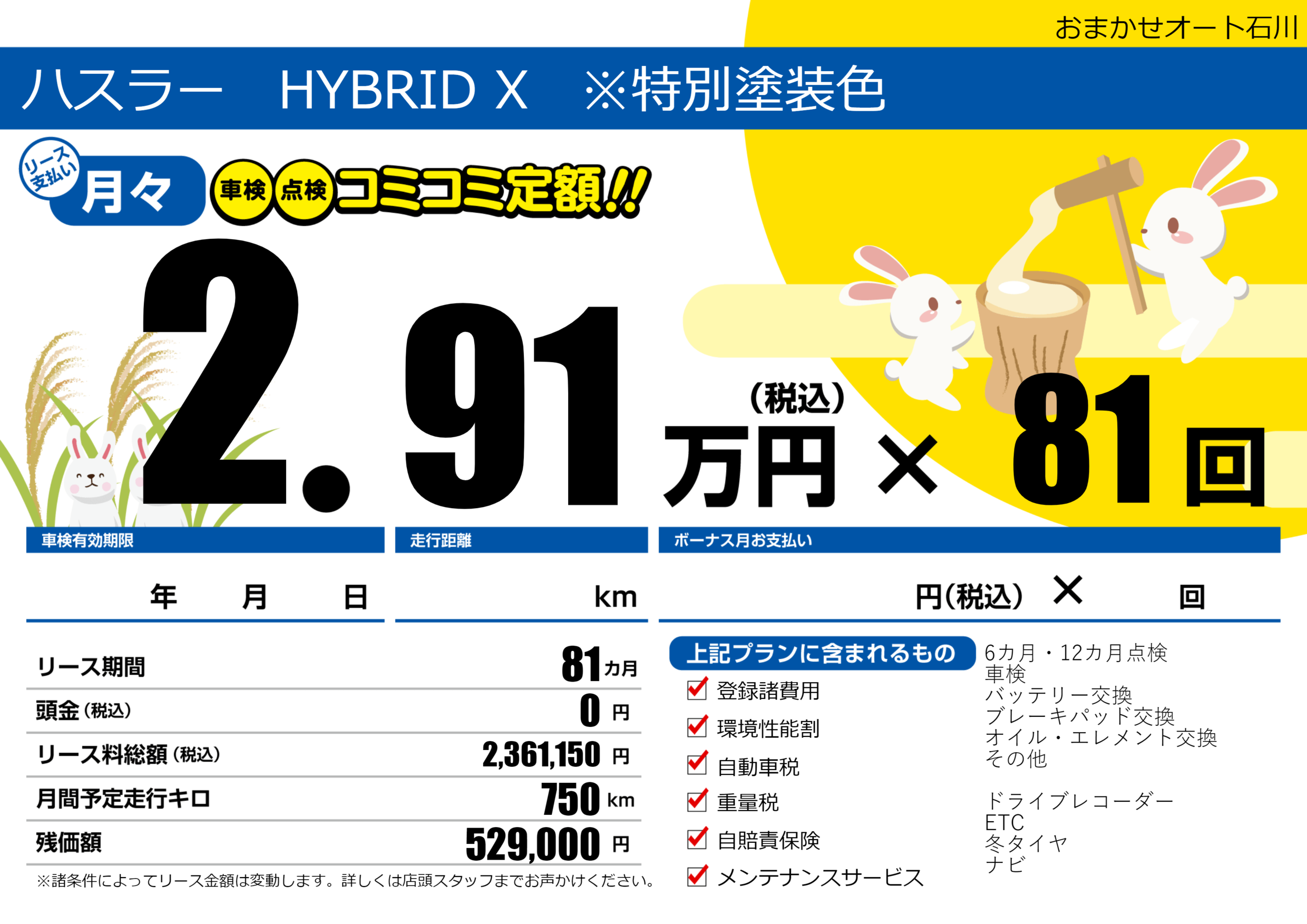 | 車名 | ハスラー HYBRID X ※特別塗装色 | グレード ミッション 排気量 |
