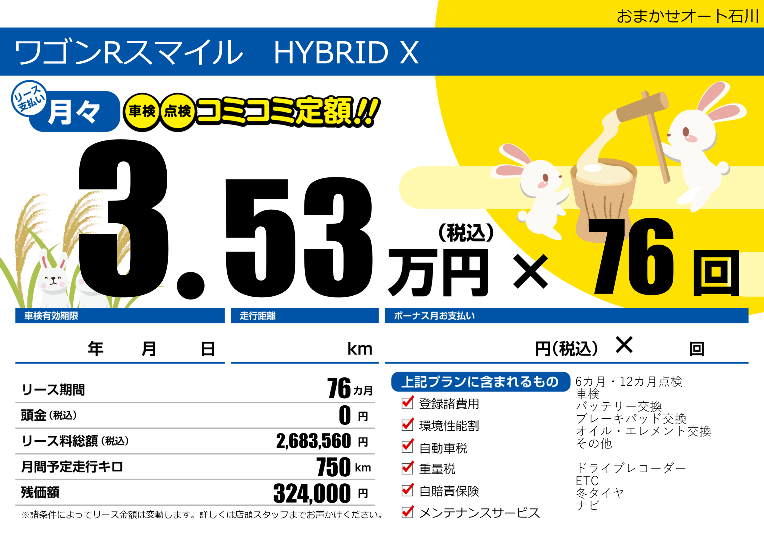 | 車名 | ワゴンRスマイル HYBRID X | グレード ミッション 排気量 |
