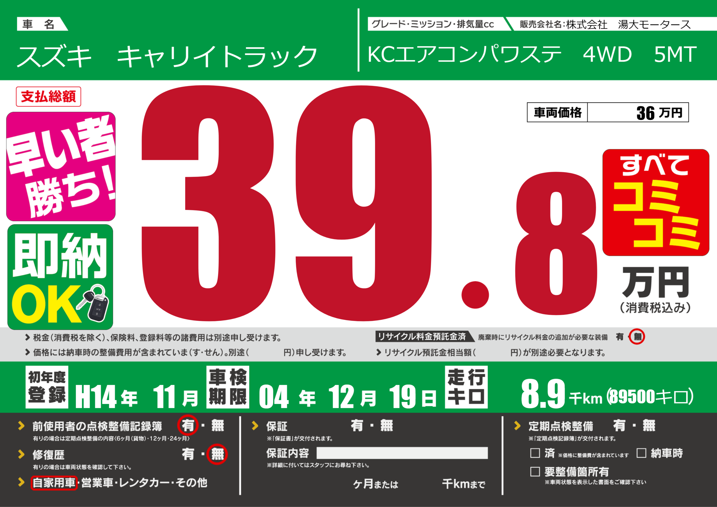 | 走行キロ | 0.8万km | 初年度登録 | H14年11月 |