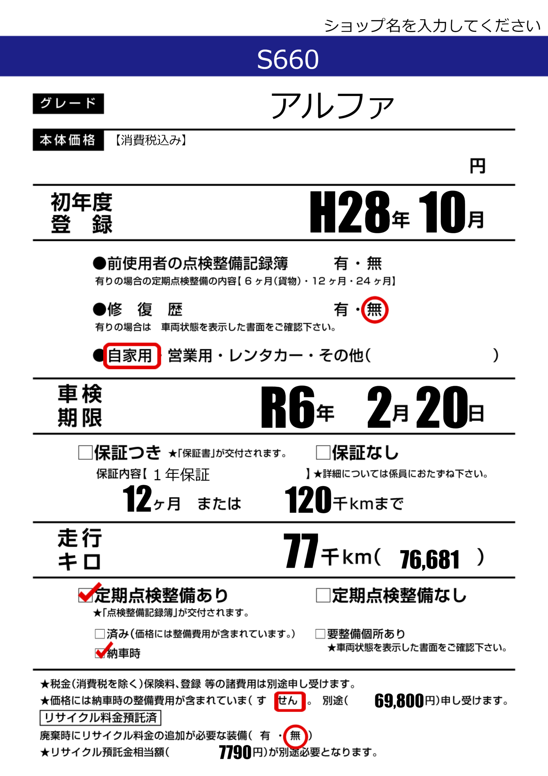 | 定期点検整備 | 定期点検整備あり 納車時あり | ||
