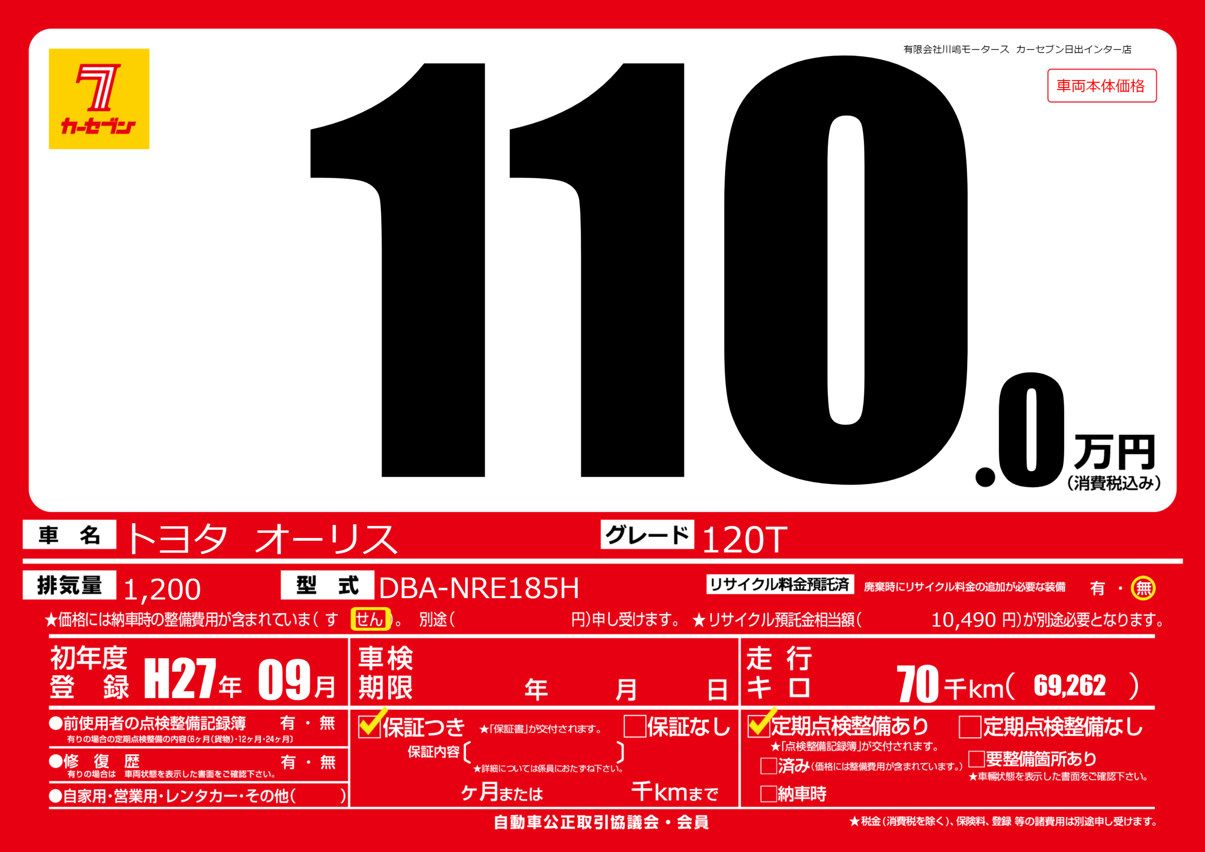 | 車名 | トヨタ オーリス | グレード ミッション 排気量 |