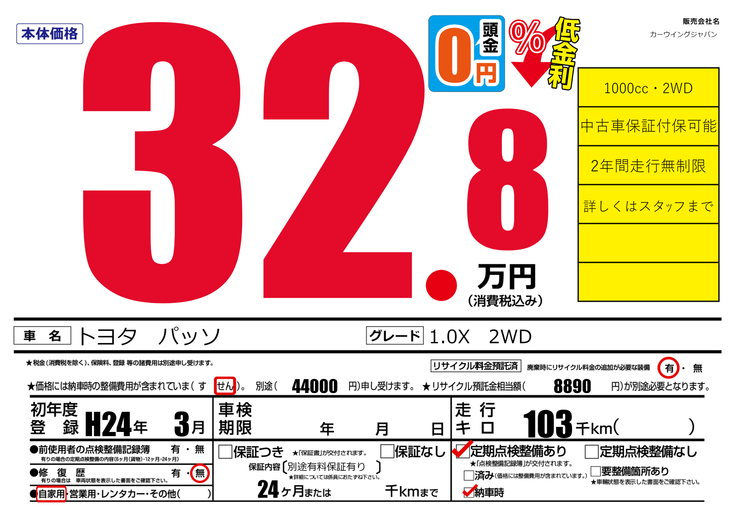 | 車名 | トヨタ パッソ | グレード ミッション 排気量 |