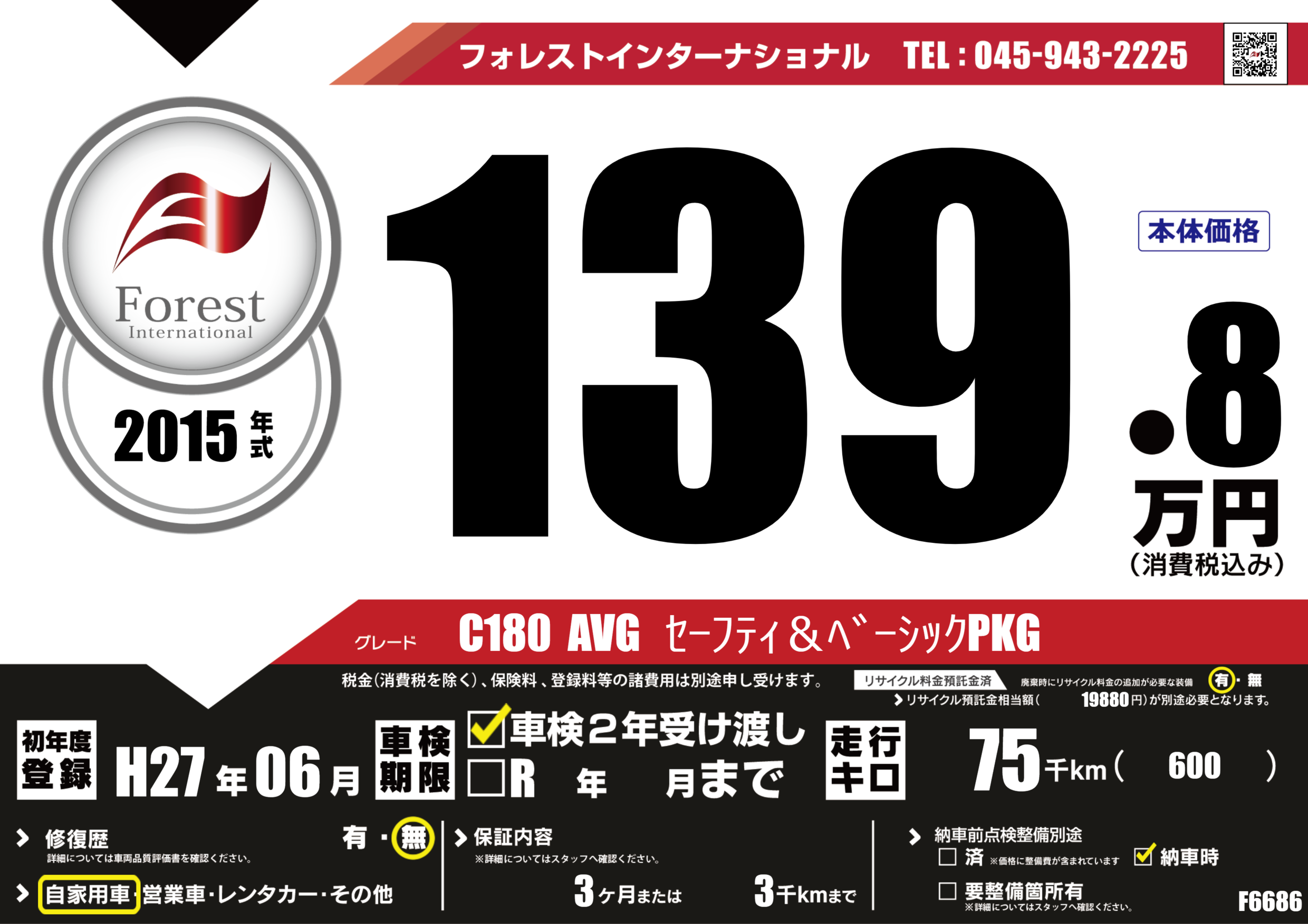| 走行キロ | 7.5万km | 初年度登録 | H27年06月 |