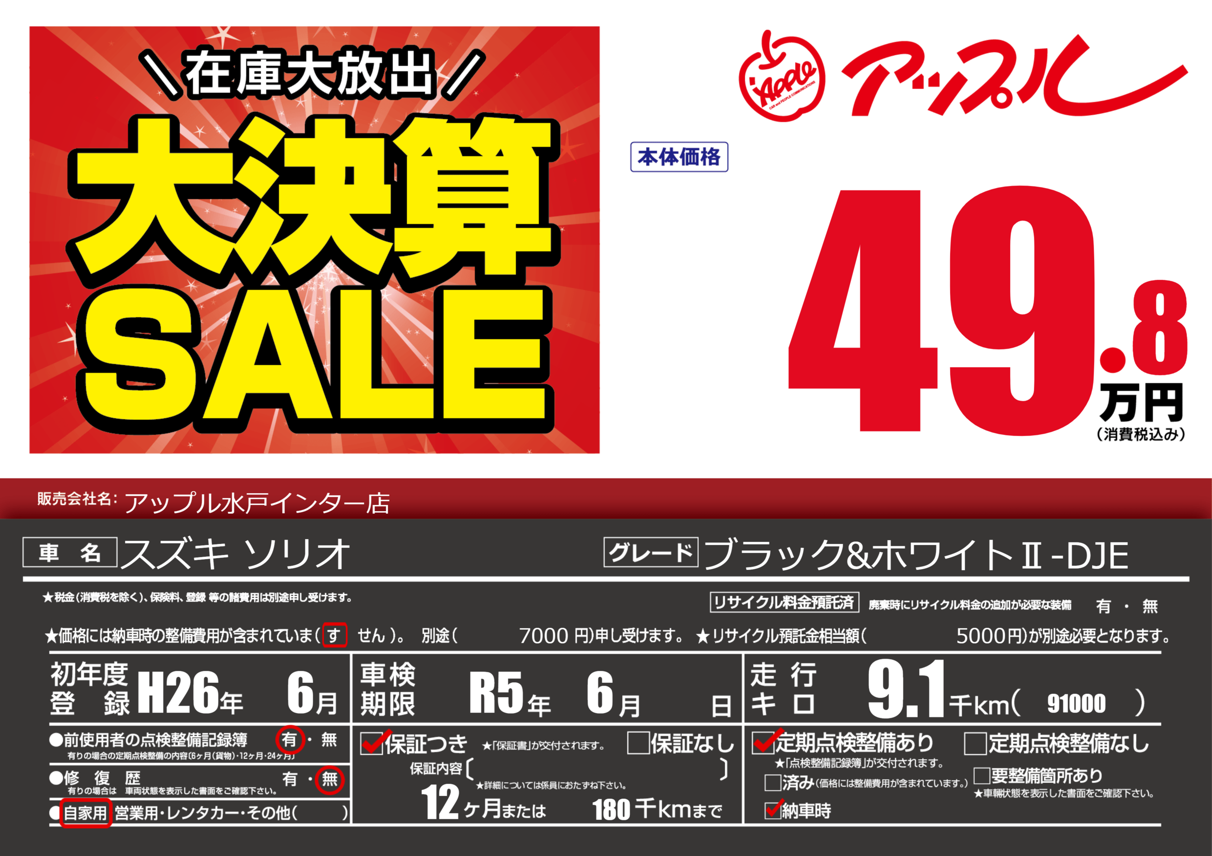 | 定期点検整備 | 定期点検整備あり 納車時あり | ||