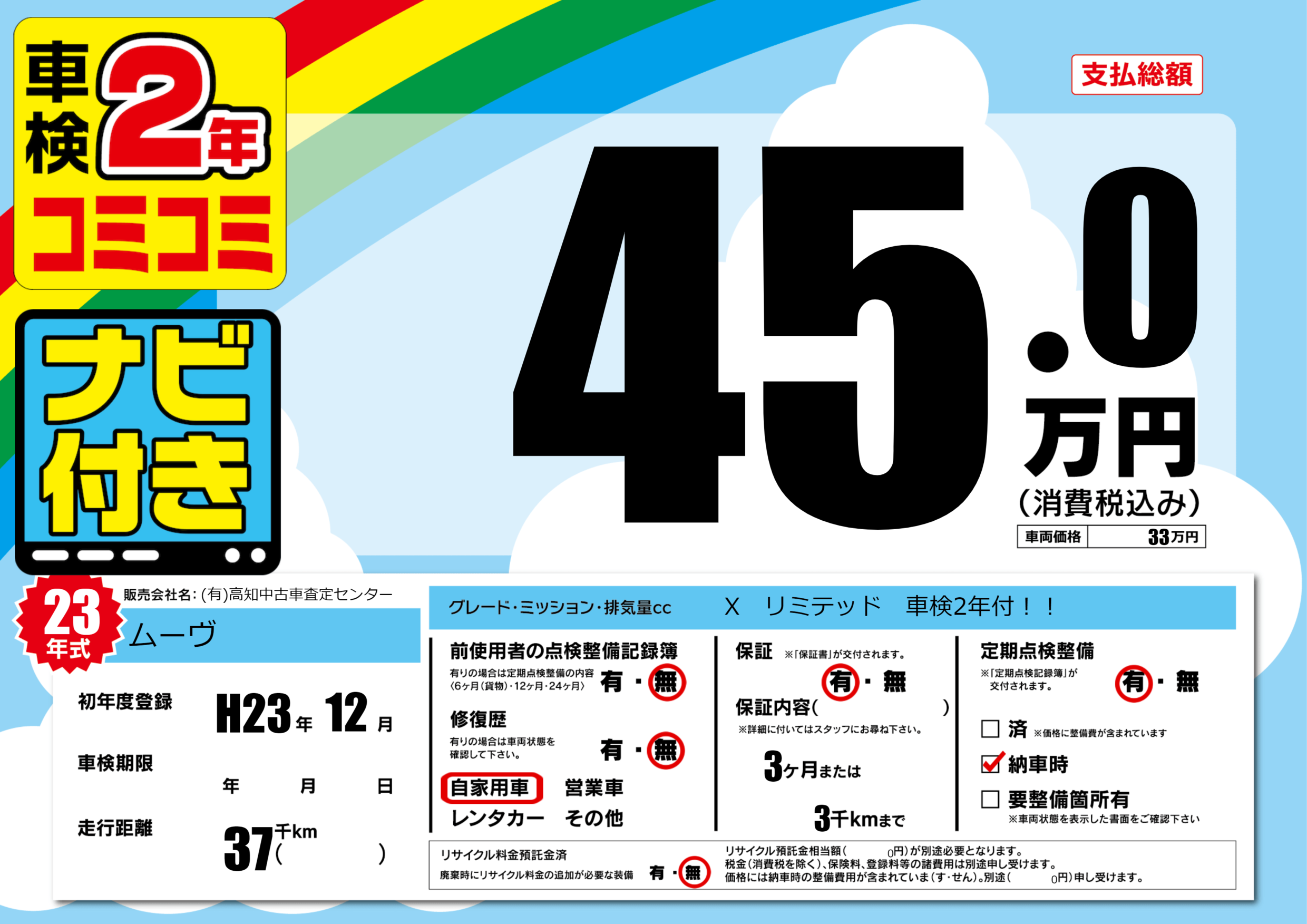 | 定期点検整備 | 定期点検整備あり 納車時あり | ||