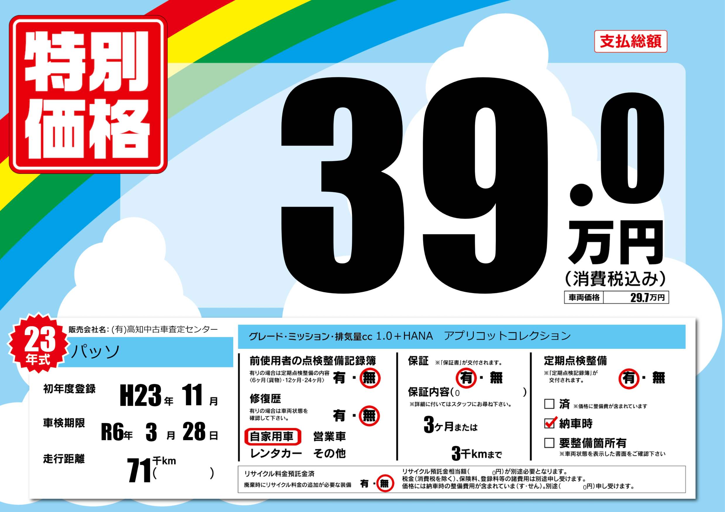 | 車名 | パッソ | グレード ミッション 排気量 |