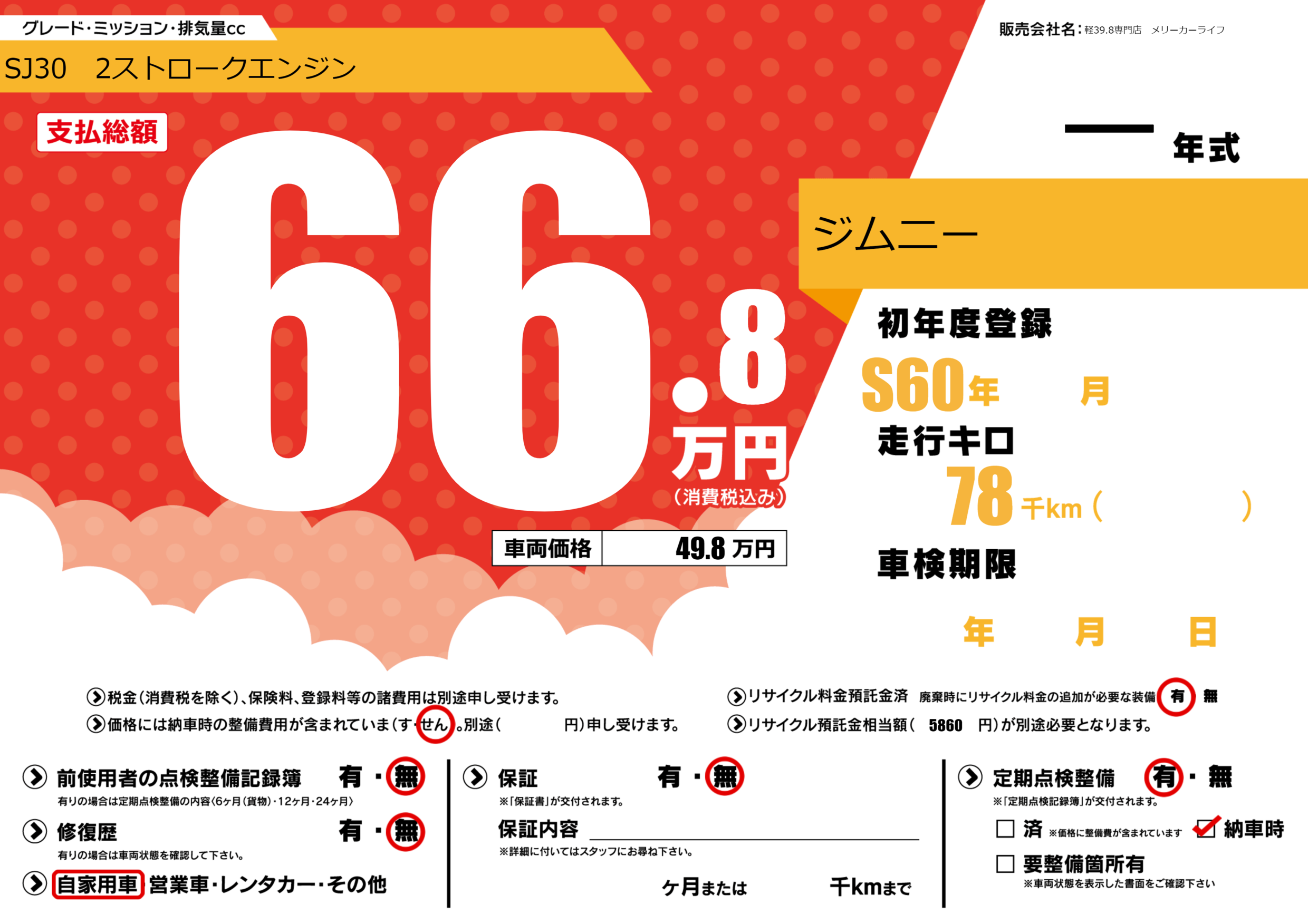 | 車名 | ジムニー | グレード ミッション 排気量 |