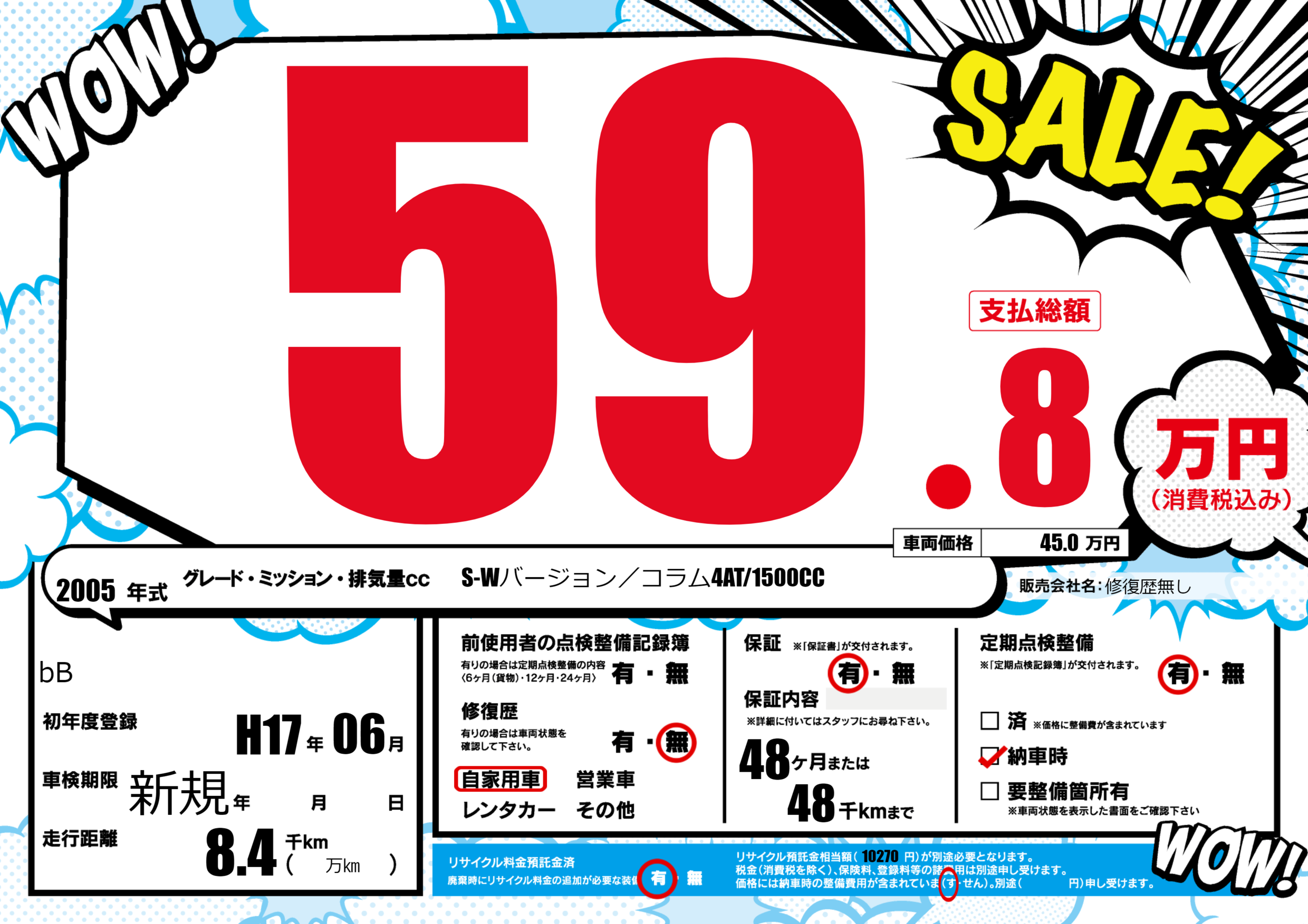 | 走行キロ | 0.8万km | 初年度登録 | H17年06月 |