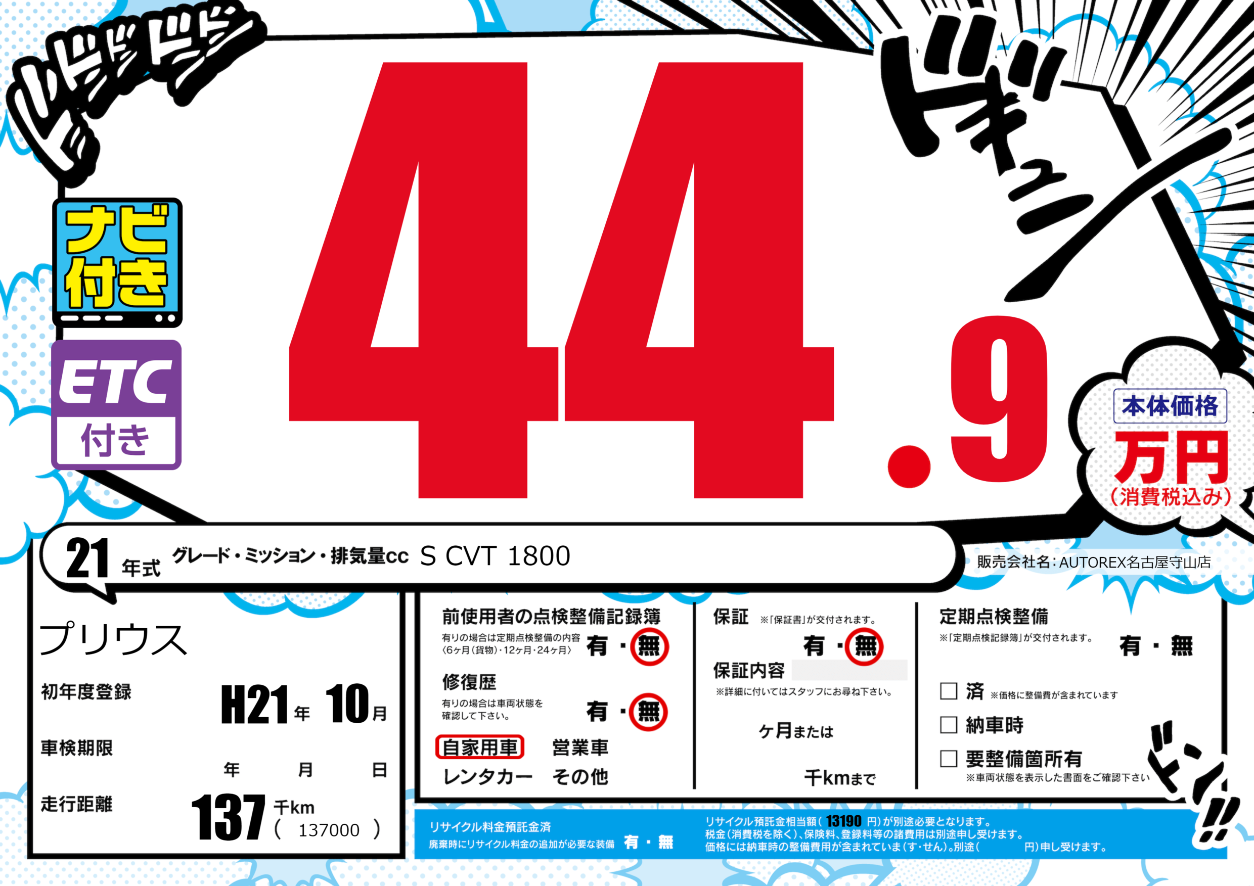 | 車名 | プリウス | グレード ミッション 排気量 |