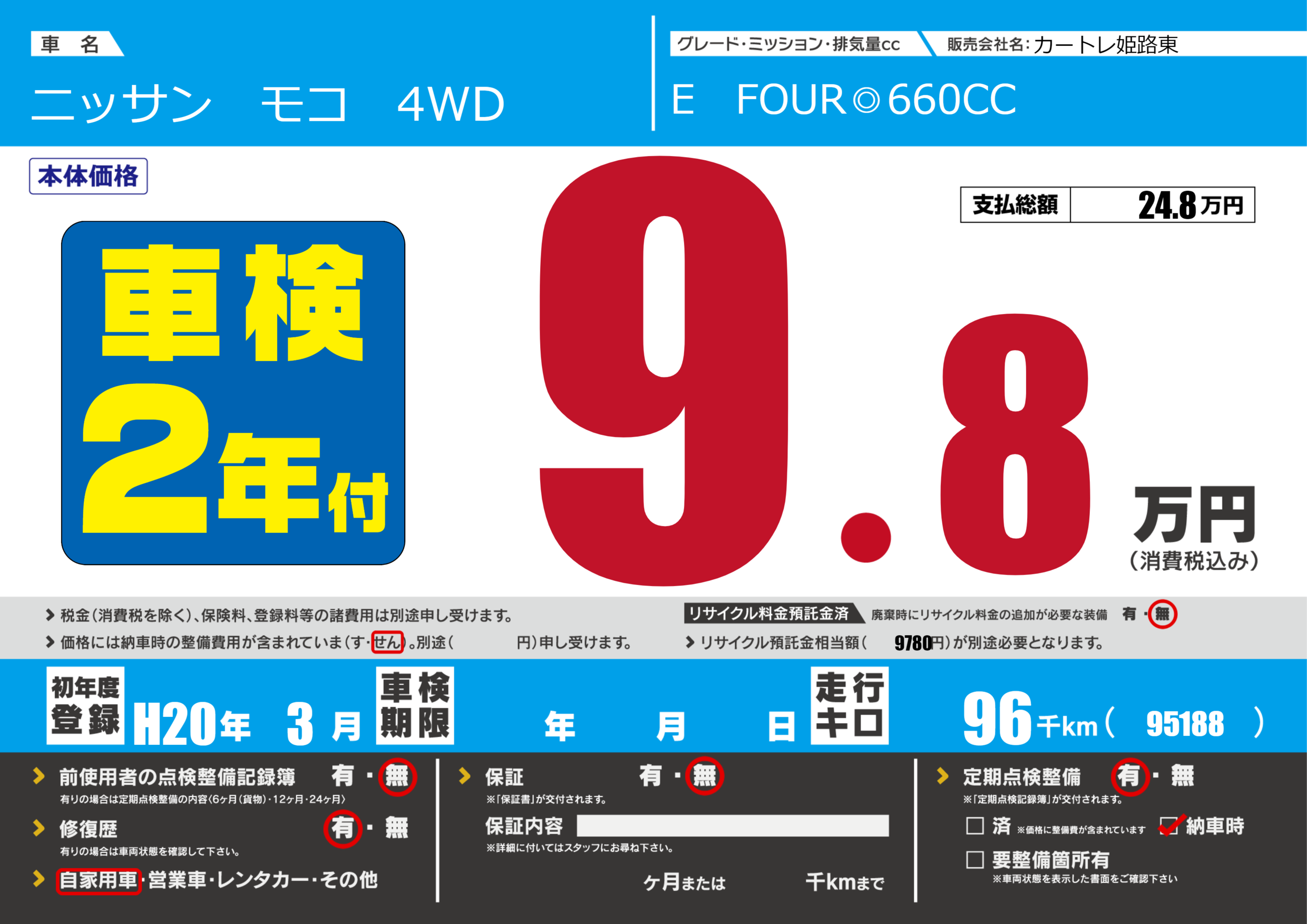 | 車名 | ニッサン モコ 4WD | グレード ミッション 排気量 |