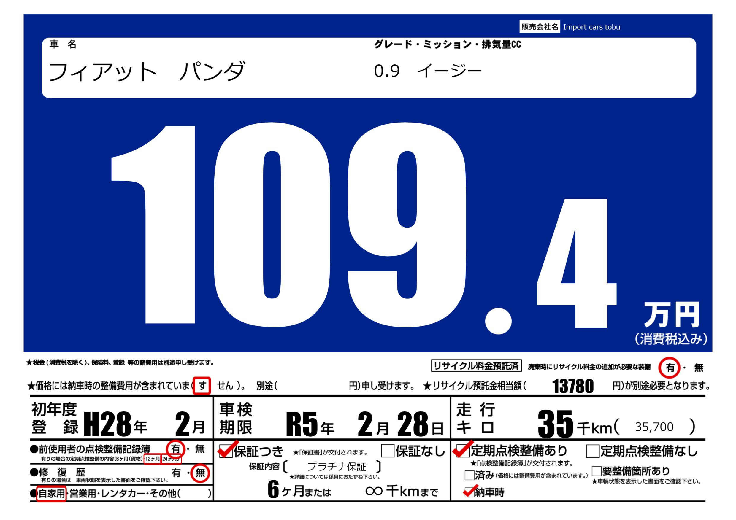 | 車名 | フィアット パンダ | グレード ミッション 排気量 |