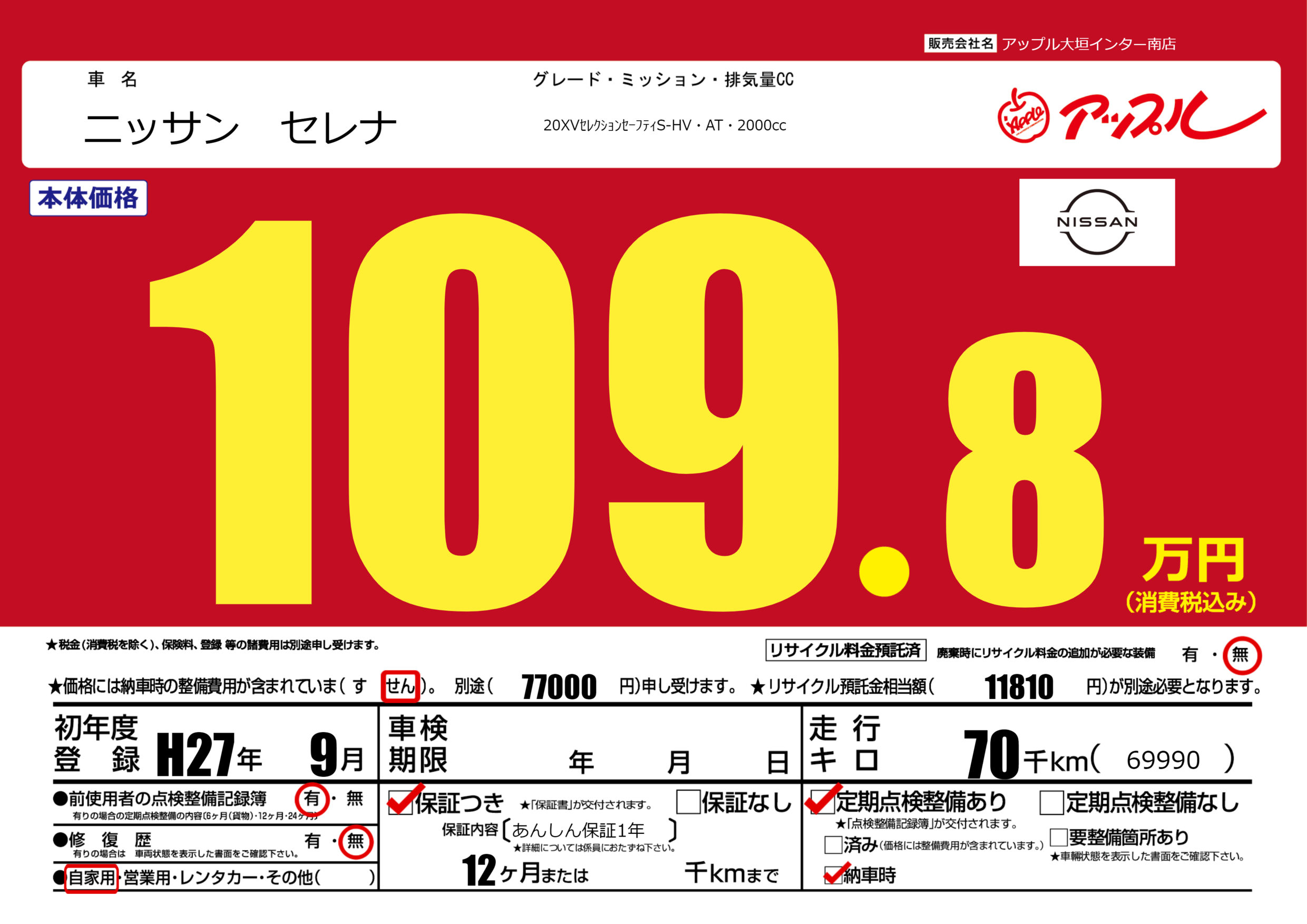 | 定期点検整備 | 定期点検整備あり 納車時あり | ||