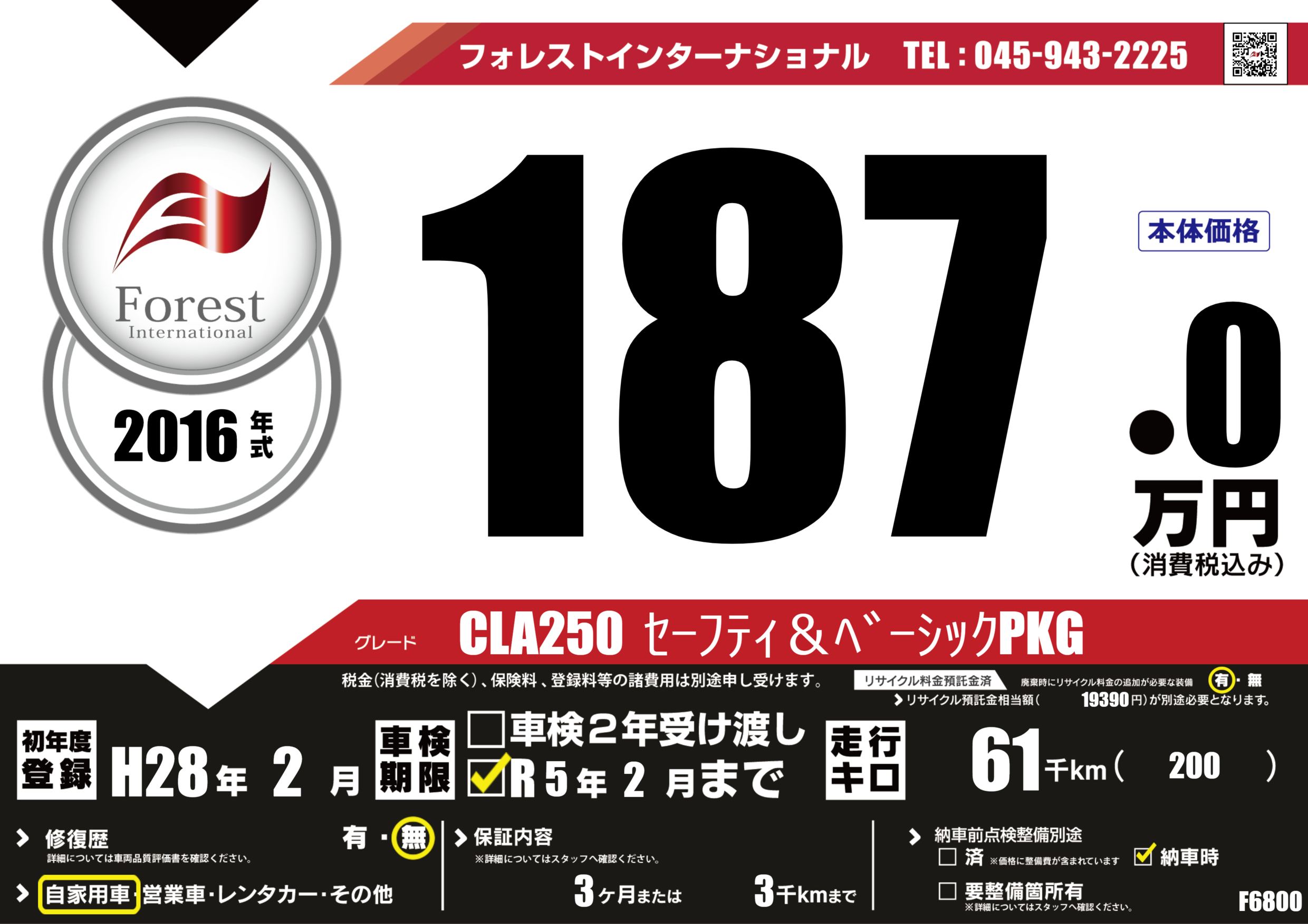 | 走行キロ | 6.1万km | 初年度登録 | H28年2月 |