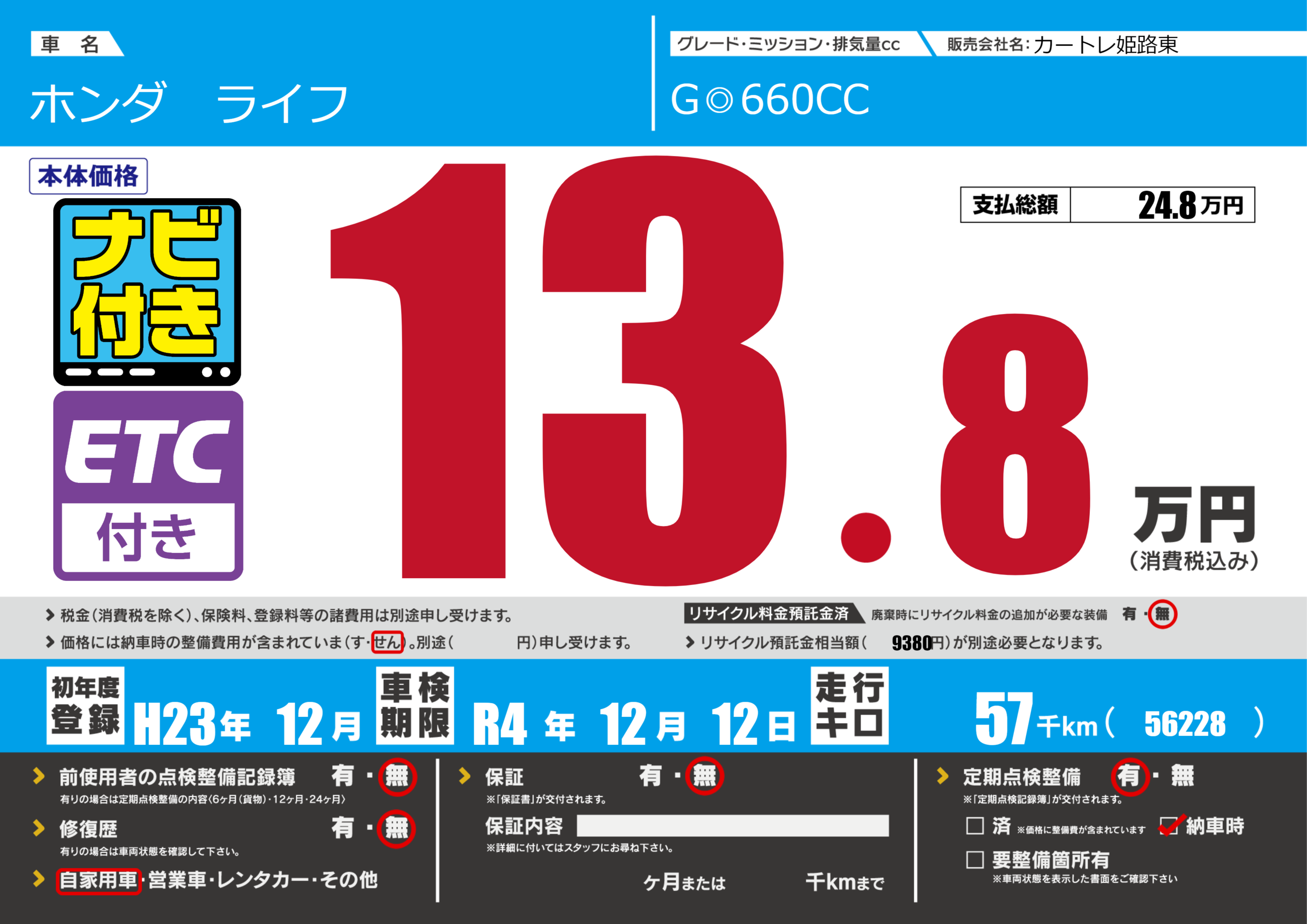 | 走行キロ | 5.7万km | 初年度登録 | H23年12月 |