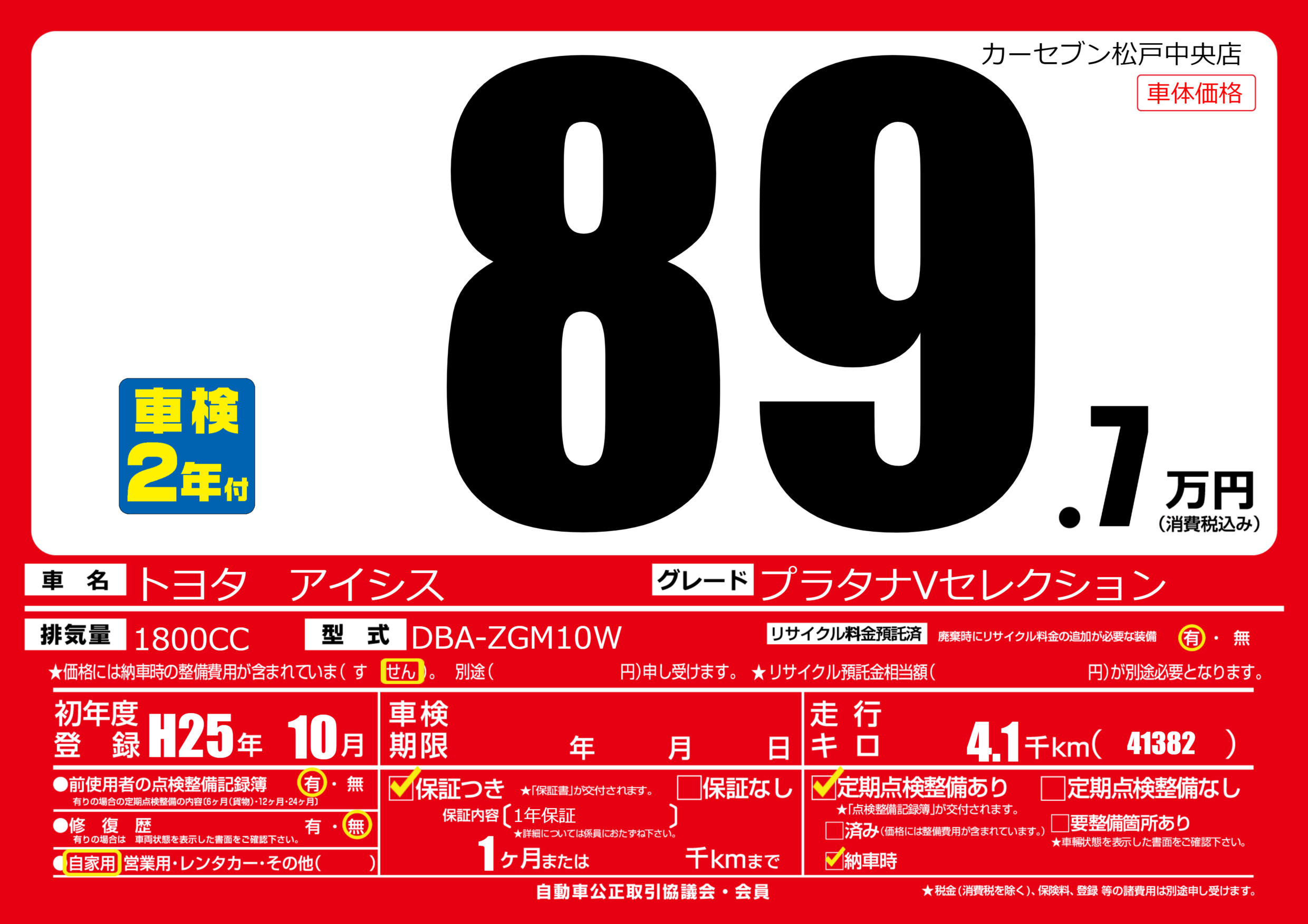 | 車名 | トヨタ アイシス | グレード ミッション 排気量 |