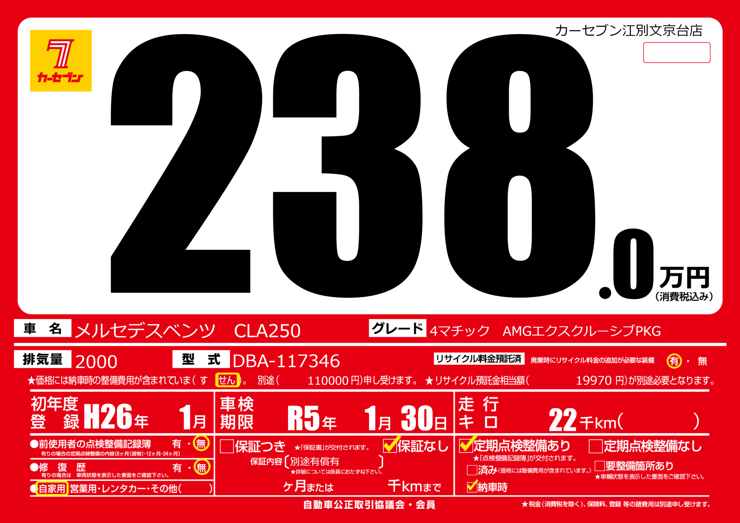 | 車名 | メルセデスベンツ CLA250 | グレード ミッション 排気量 |