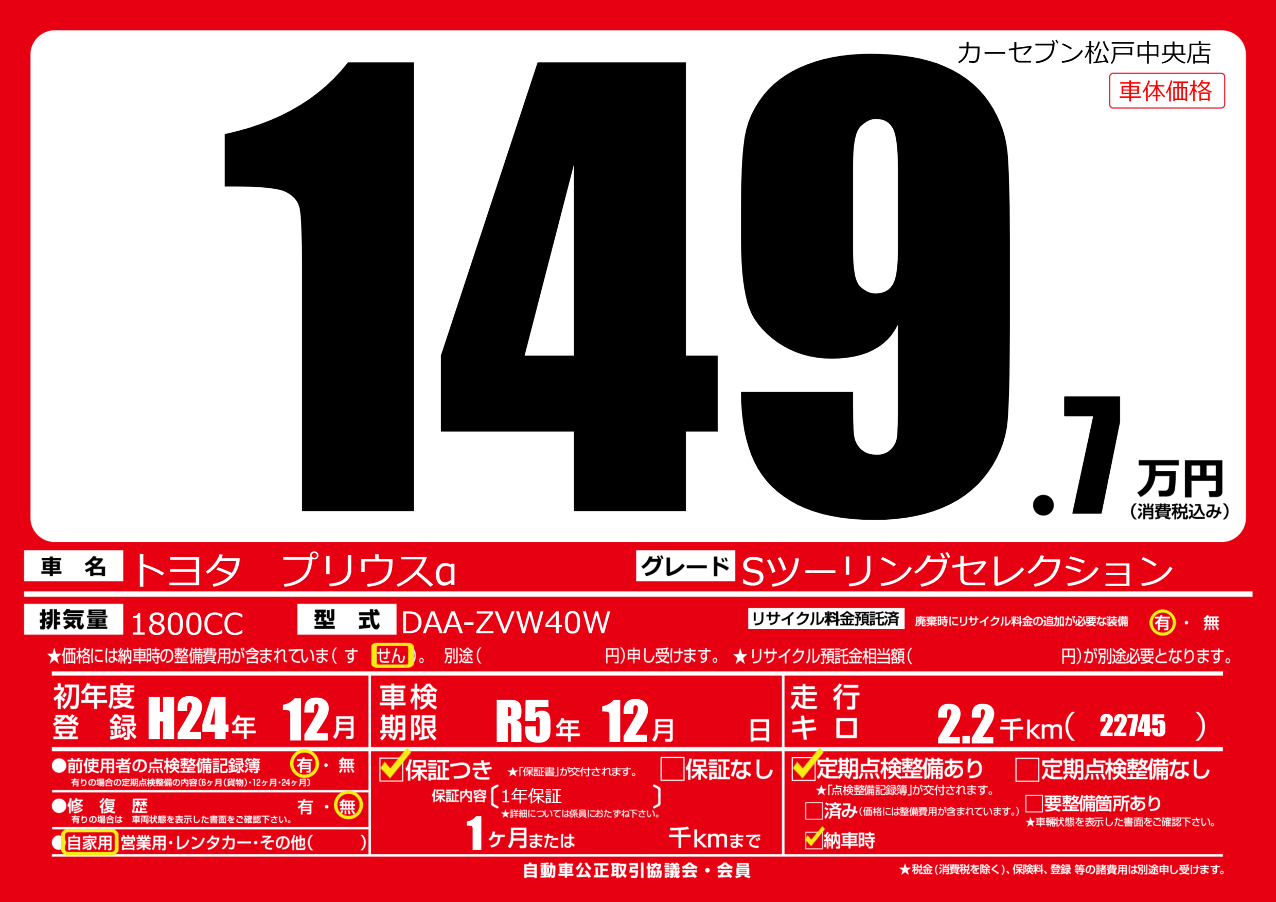 | 車名 | トヨタ プリウスα | グレード ミッション 排気量 |