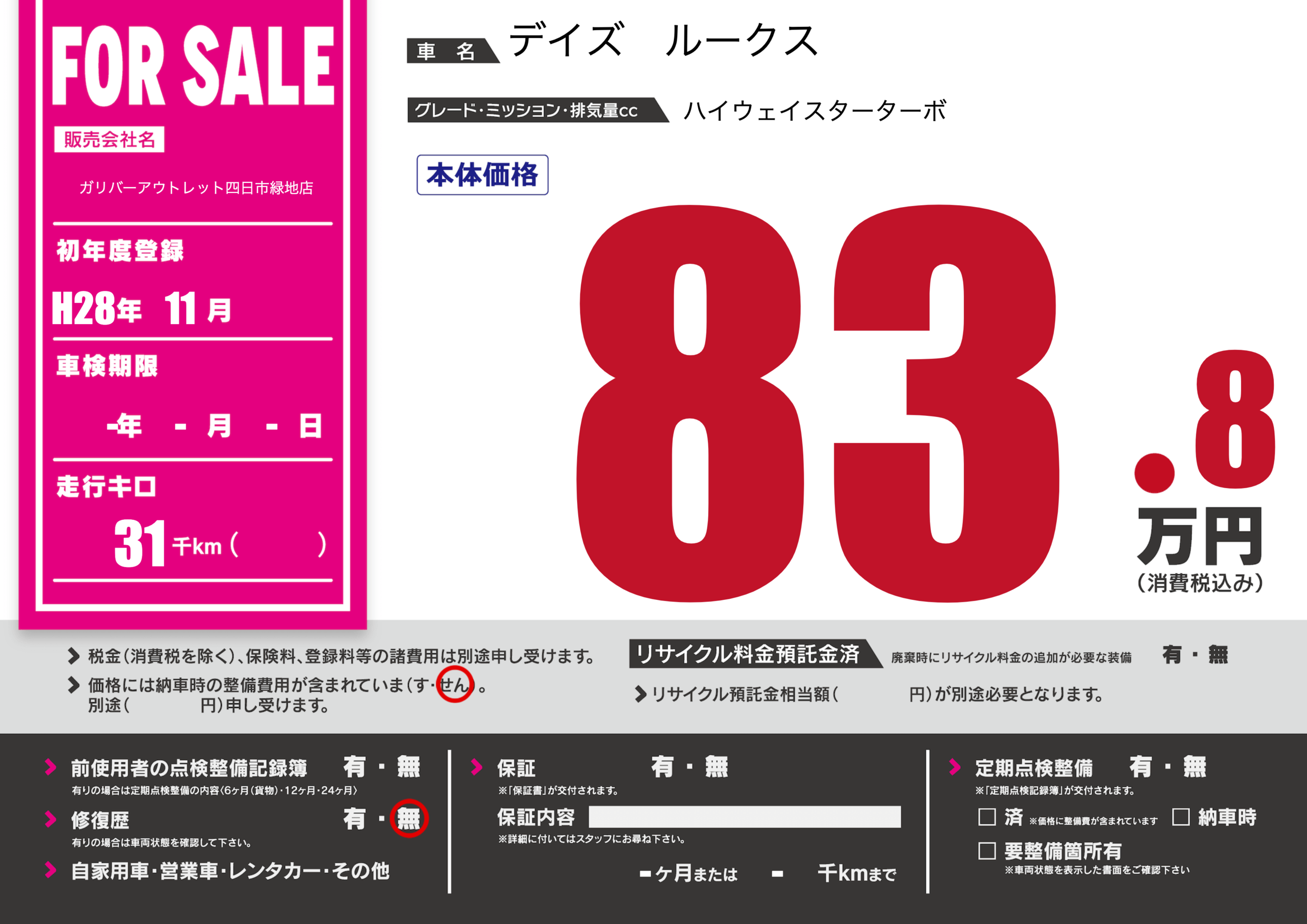 | 車名 | デイズ ルークス | グレード ミッション 排気量 |