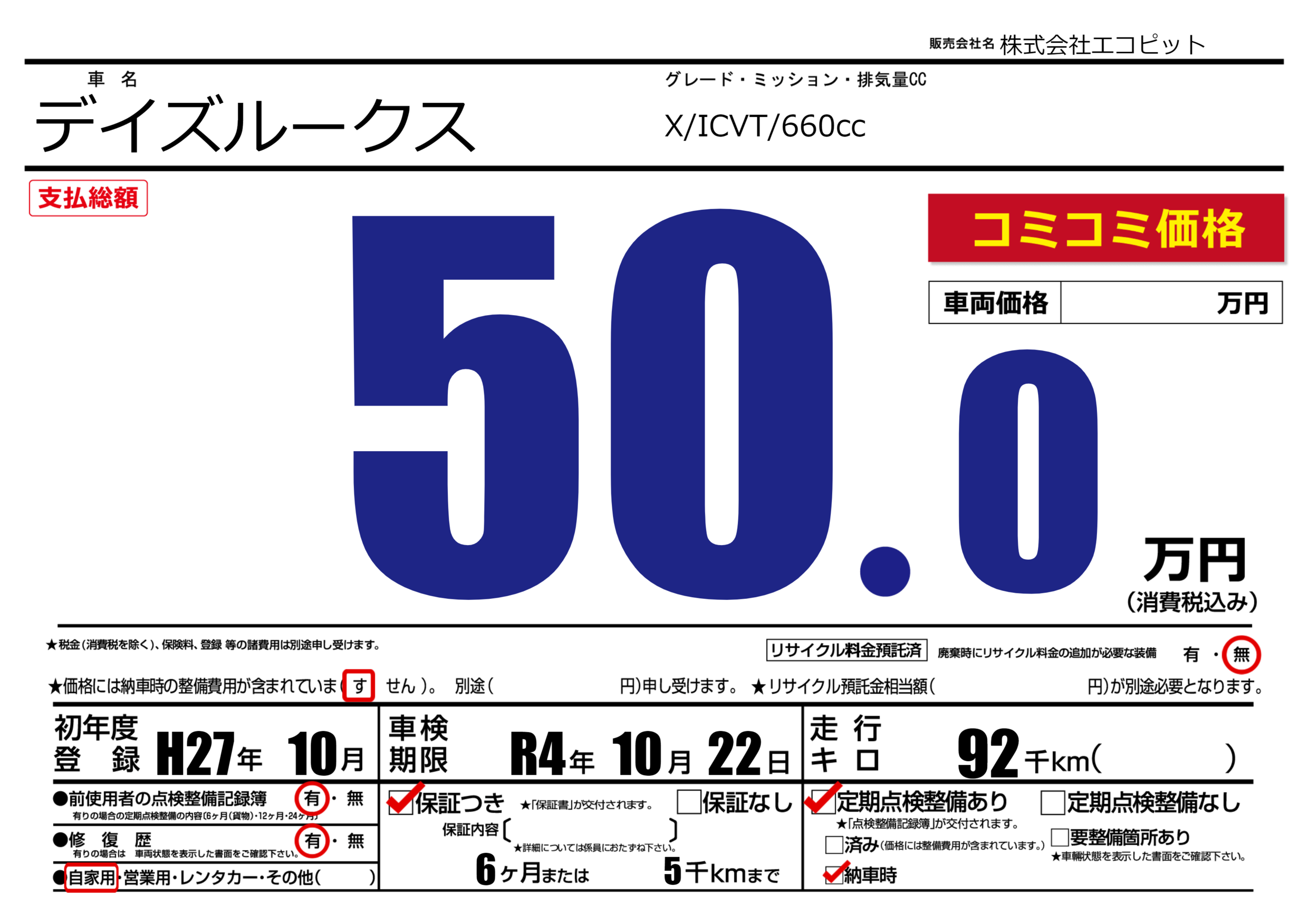 | 車名 | デイズルークス | グレード ミッション 排気量 |