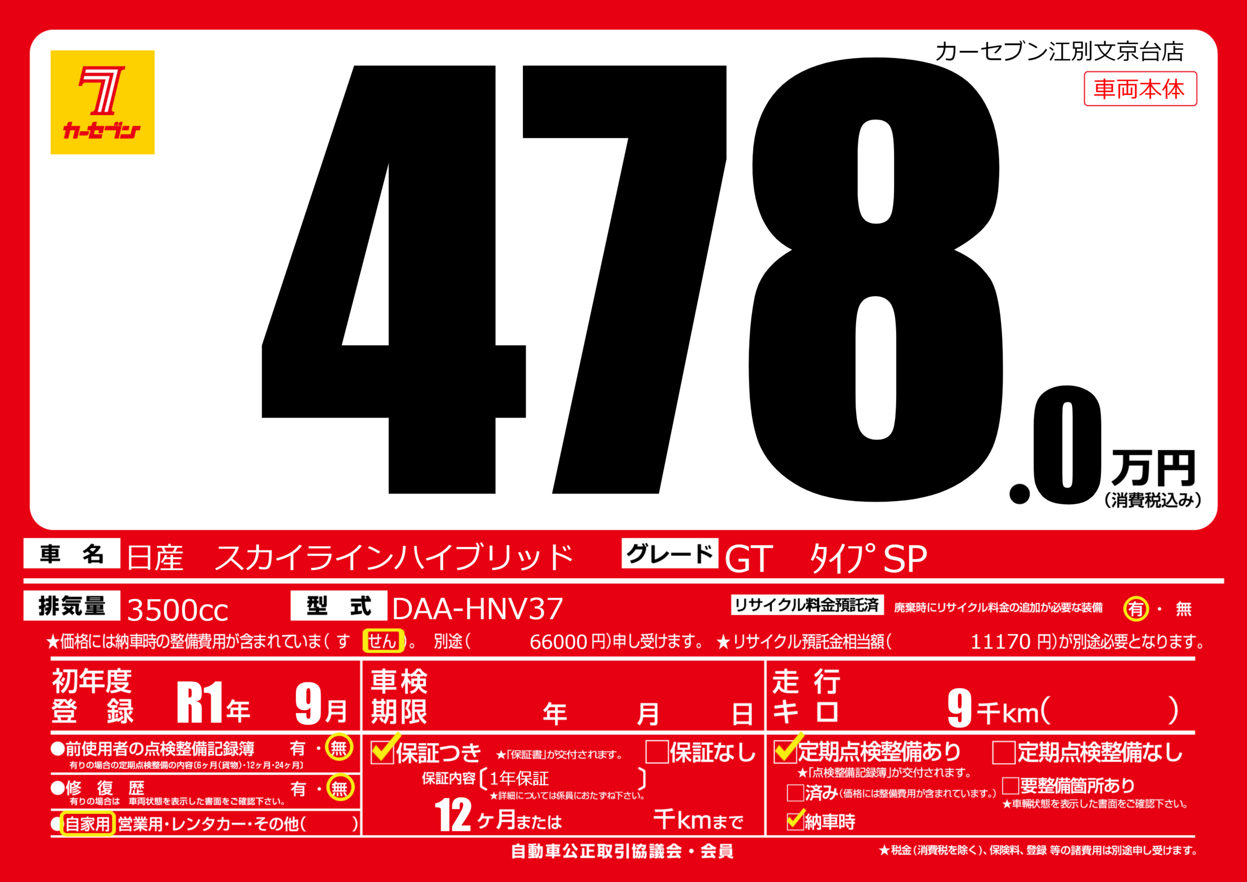 | 車名 | 日産 スカイラインハイブリッド | グレード ミッション 排気量 |