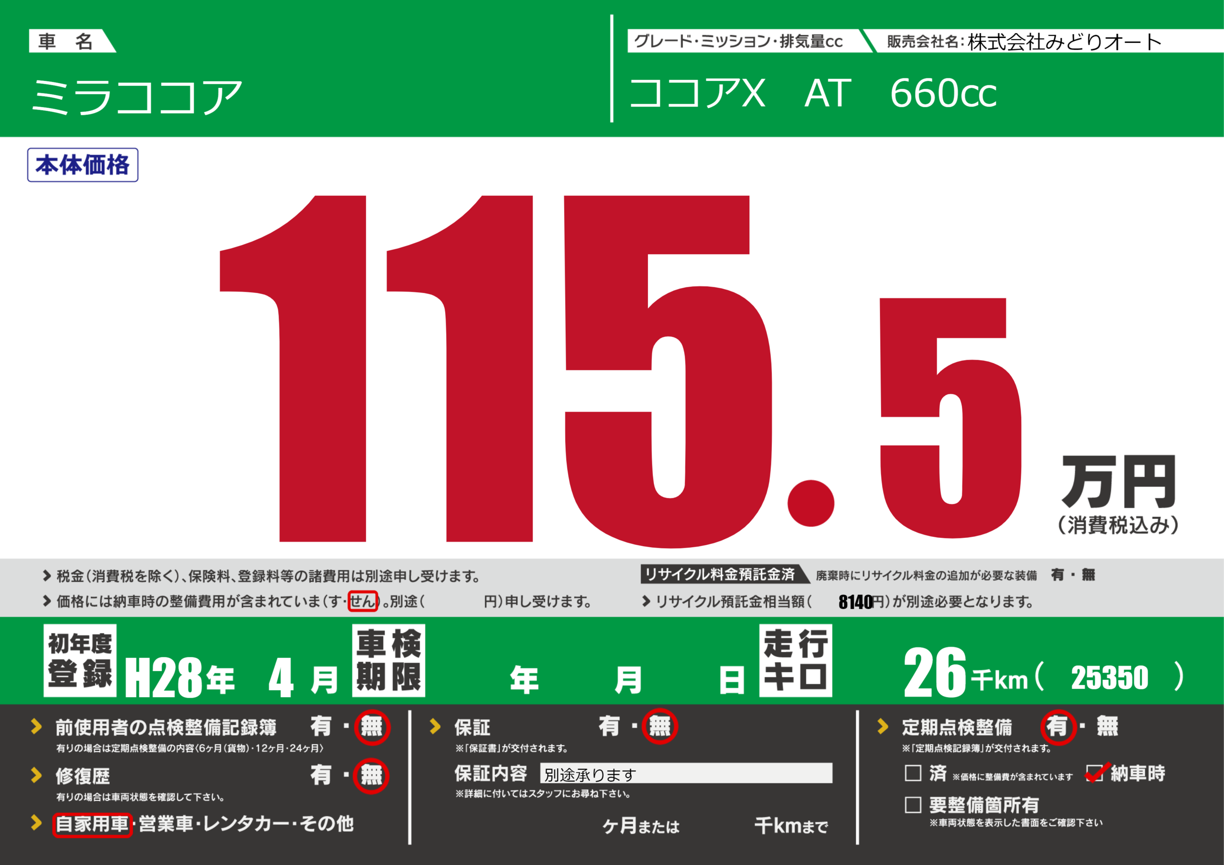 | 車名 | ミラココア | グレード ミッション 排気量 |