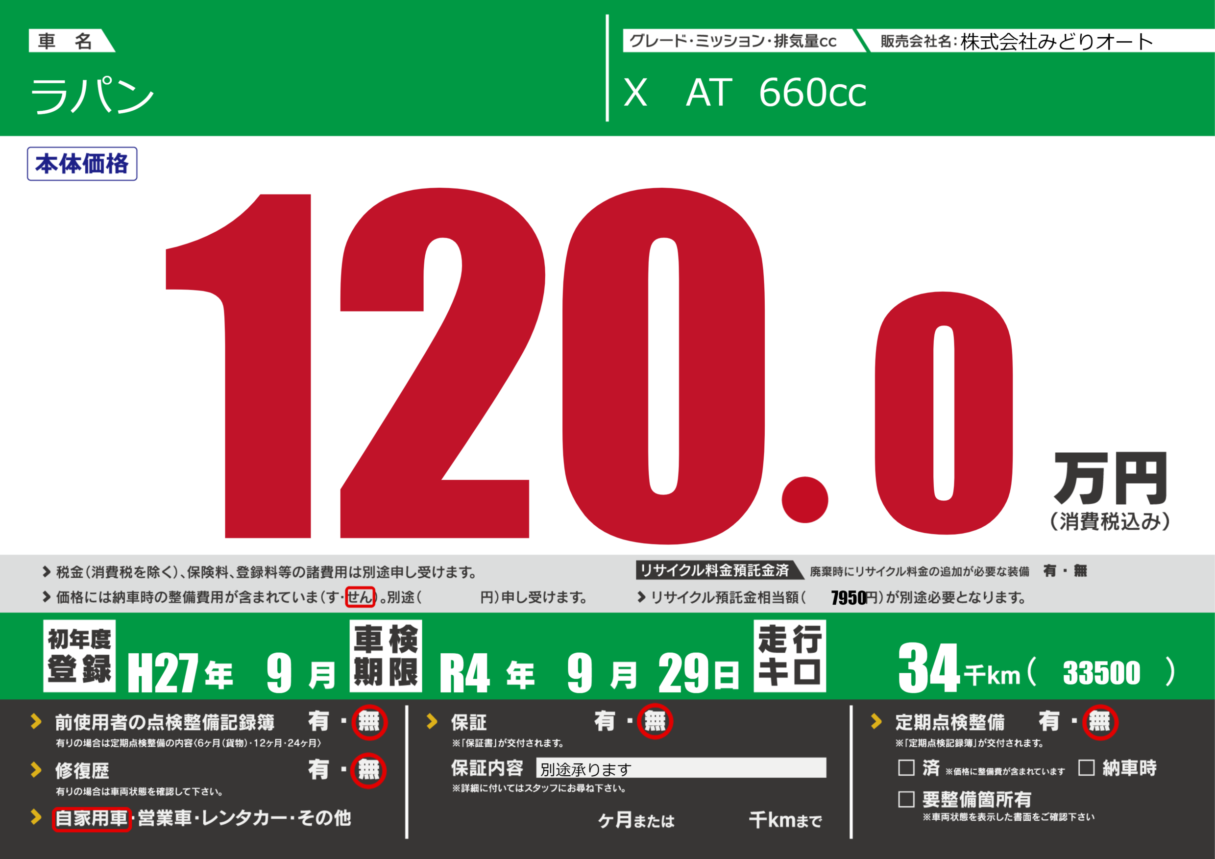 | 車名 | ラパン | グレード ミッション 排気量 |
