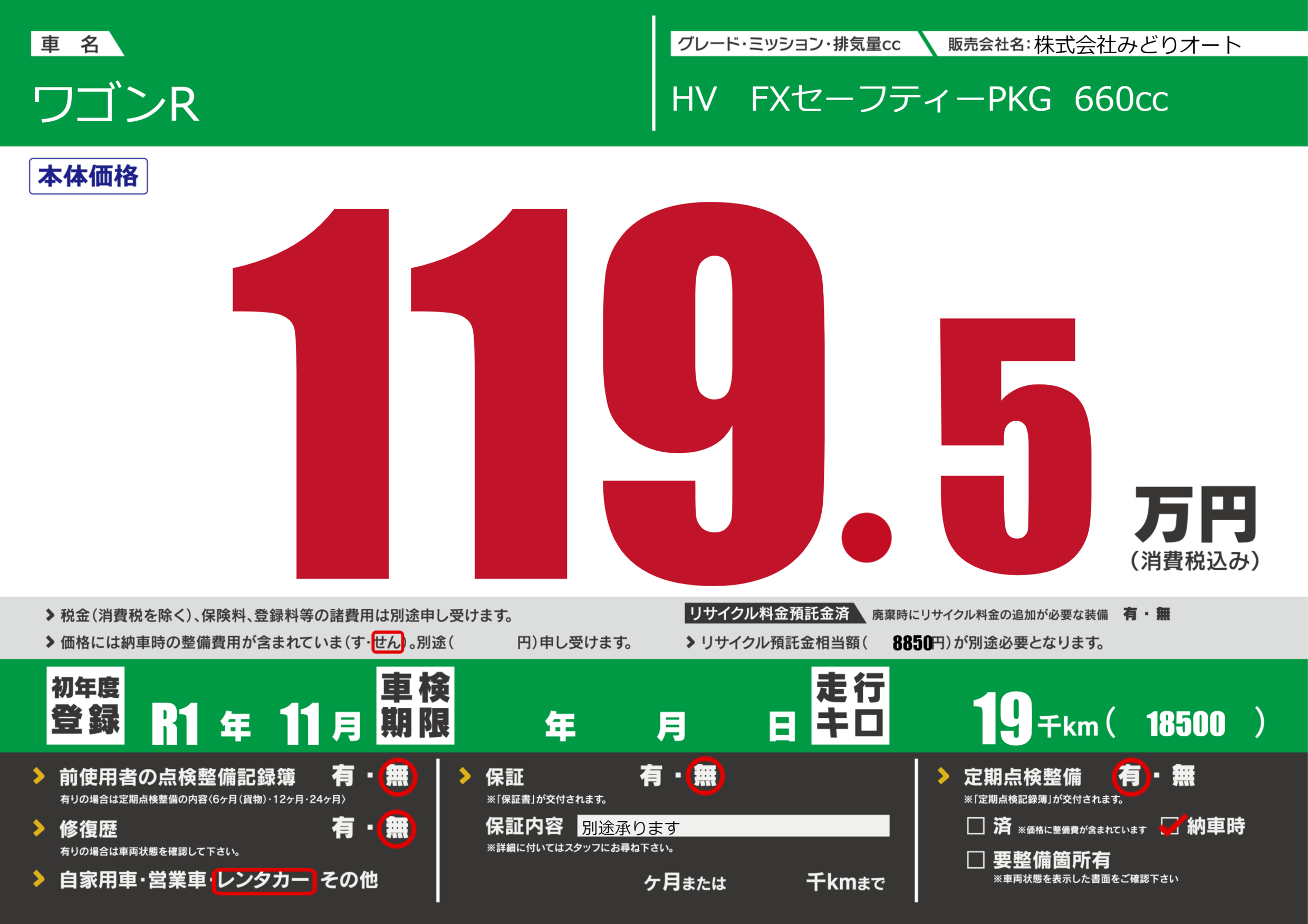 | 定期点検整備 | 定期点検整備あり 納車時あり | ||