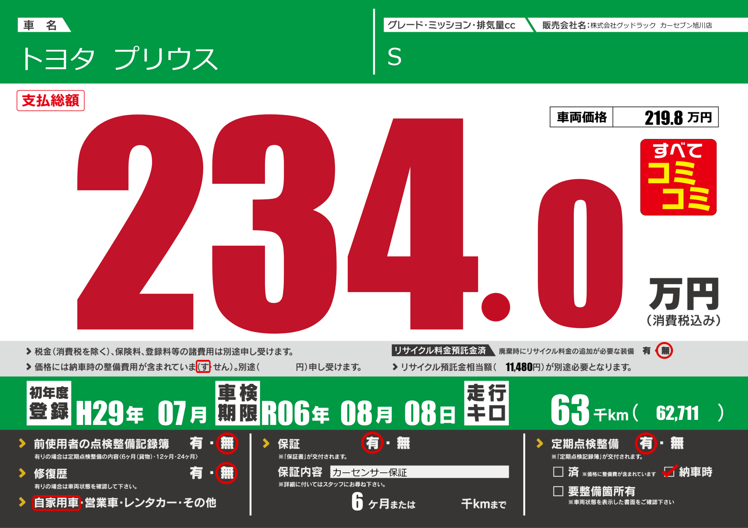 | 車名 | トヨタ プリウス | グレード ミッション 排気量 |