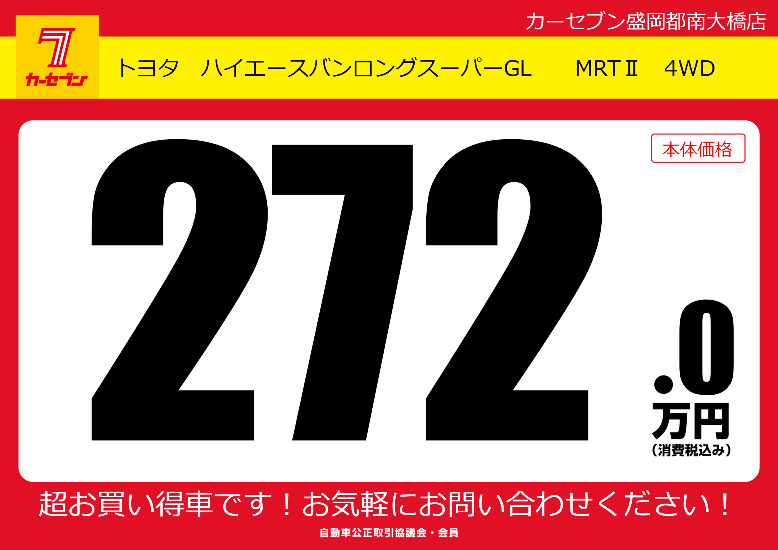 | 車名 | トヨタ ハイエースバンロングスーパーGL MRTⅡ 4WD | グレード ミッション 排気量 |