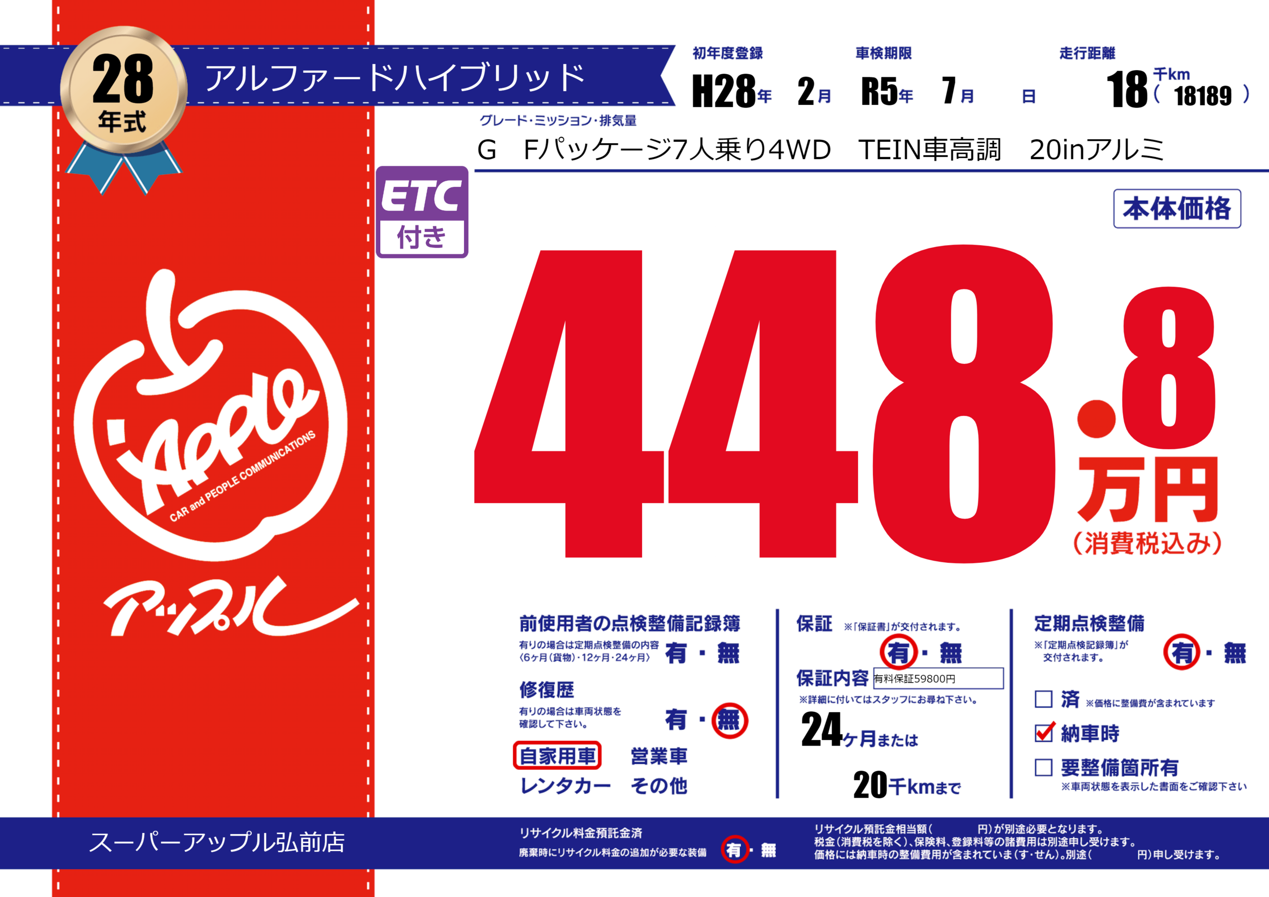 保証付き 保証内容(有料保証59800円) 24ヶ月または20千km |