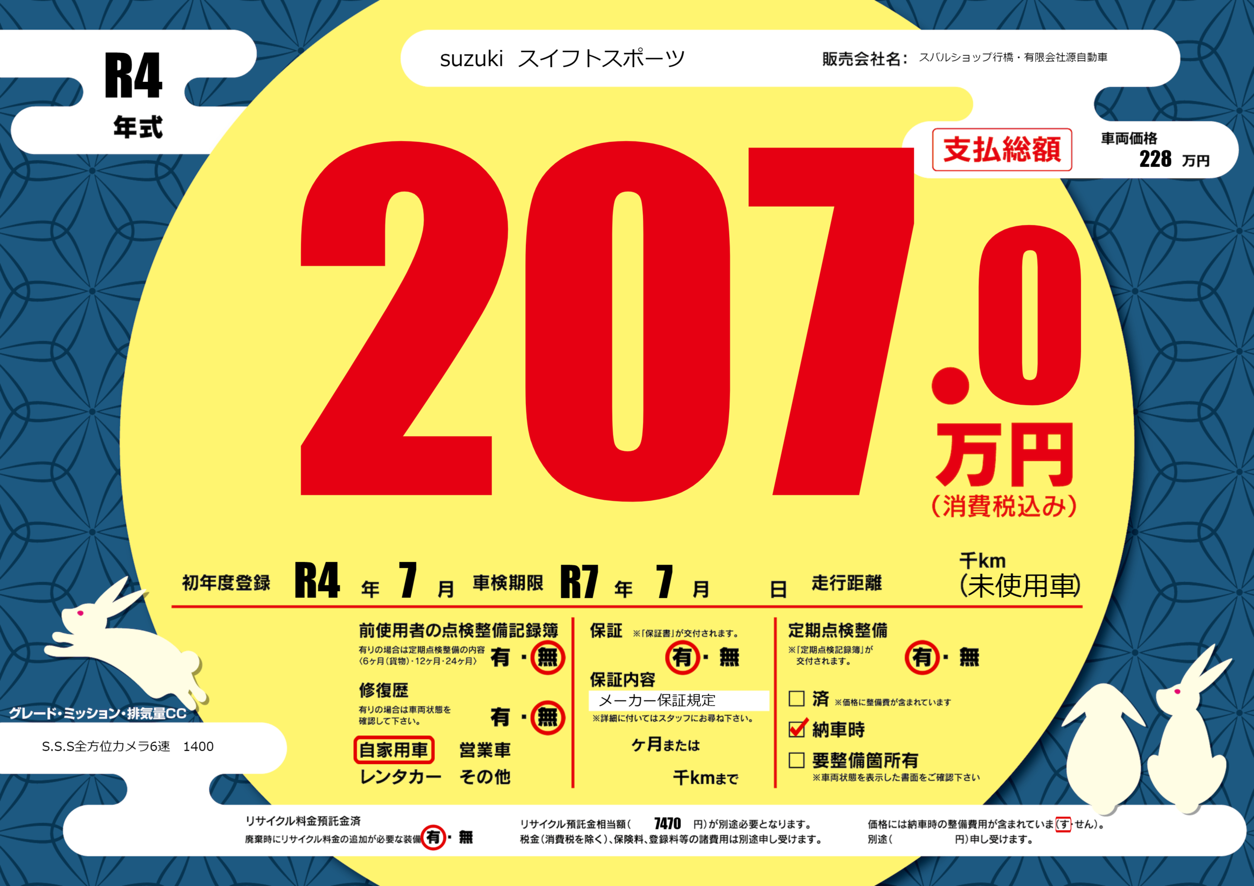 | 走行キロ | - | 初年度登録 | R4年7月 |